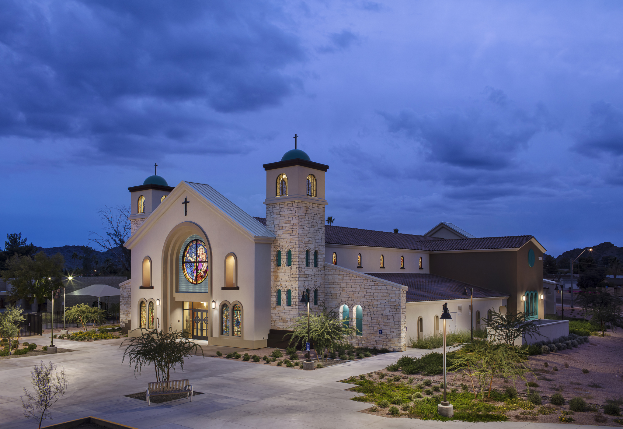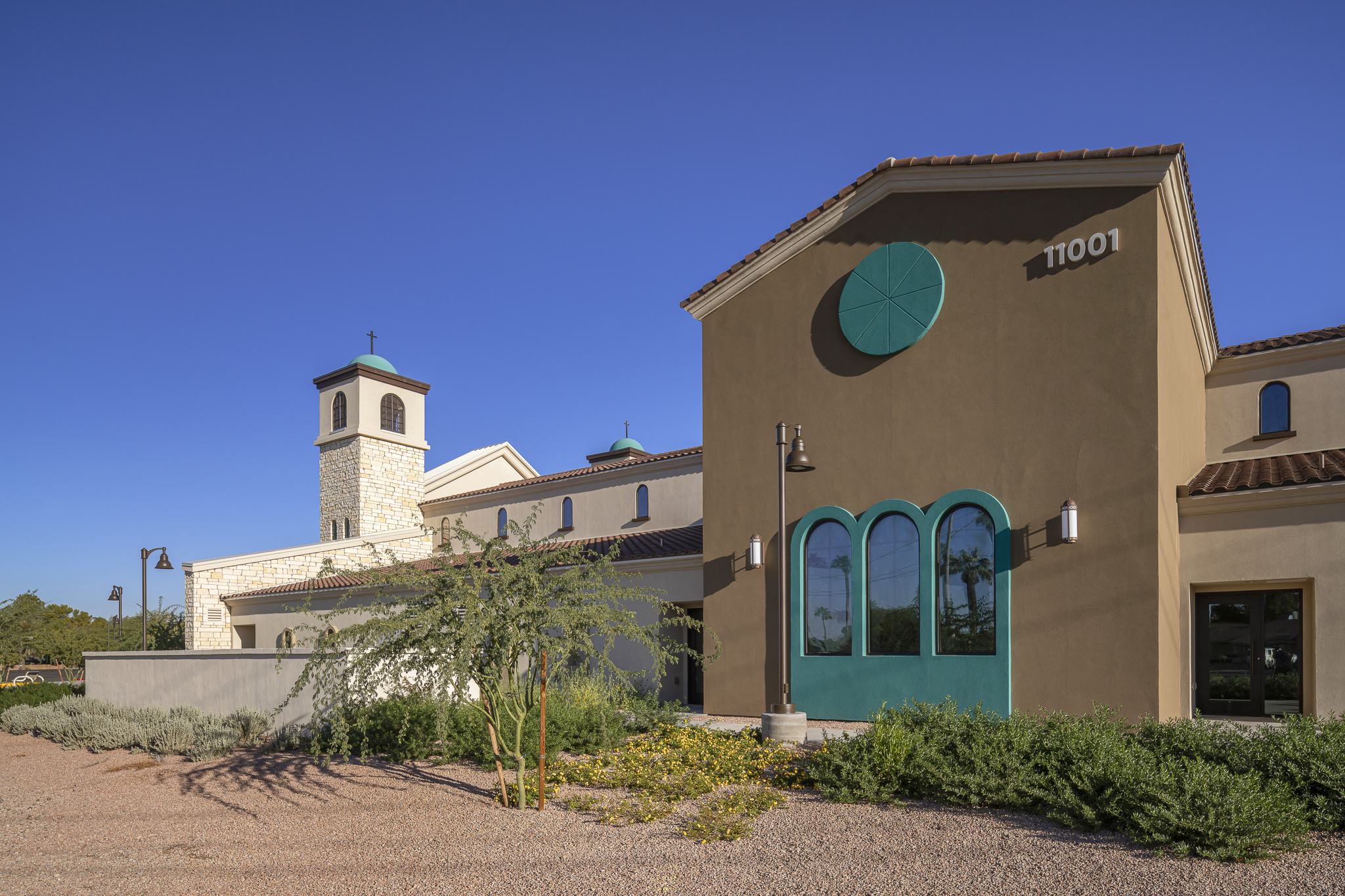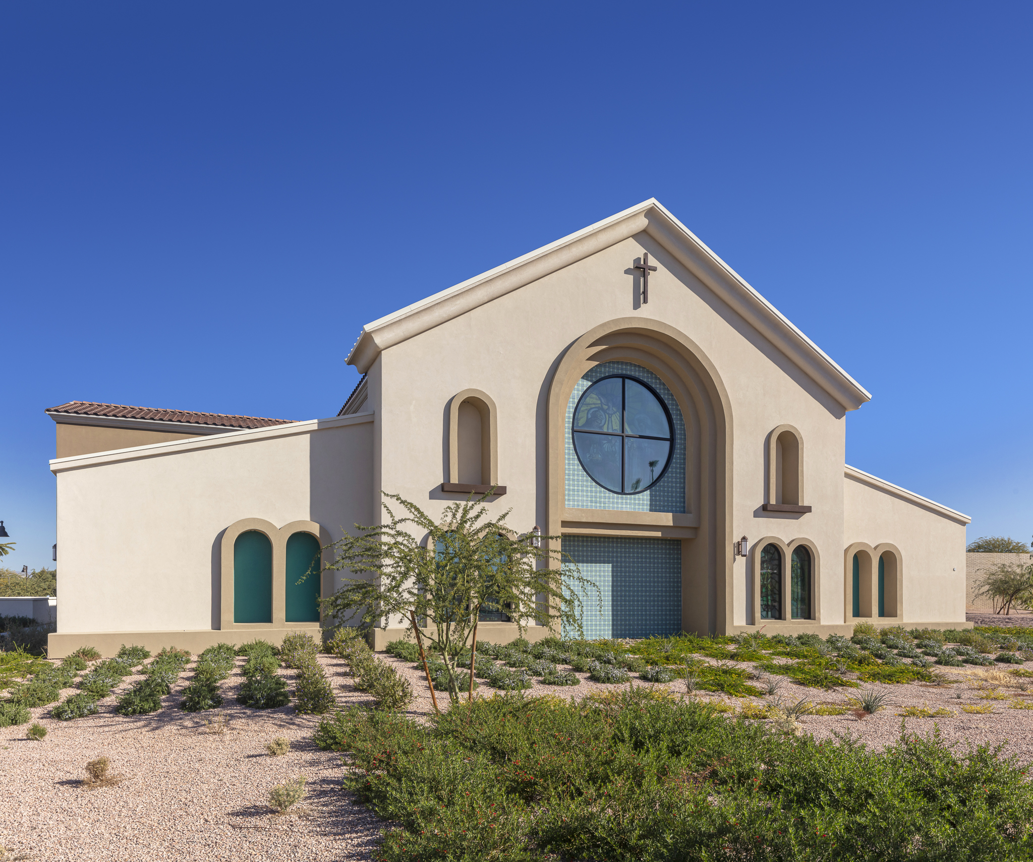 The main exterior finishes include EIFS (exterior insulating finishing system) and stone veneer applications. The color and materials palette that combines stone materials with a white base color and turquoise accent colors presents a Spanish Southwestern architecture that acknowledges both Catholic Diocese needs as well as our native Arizona environment.