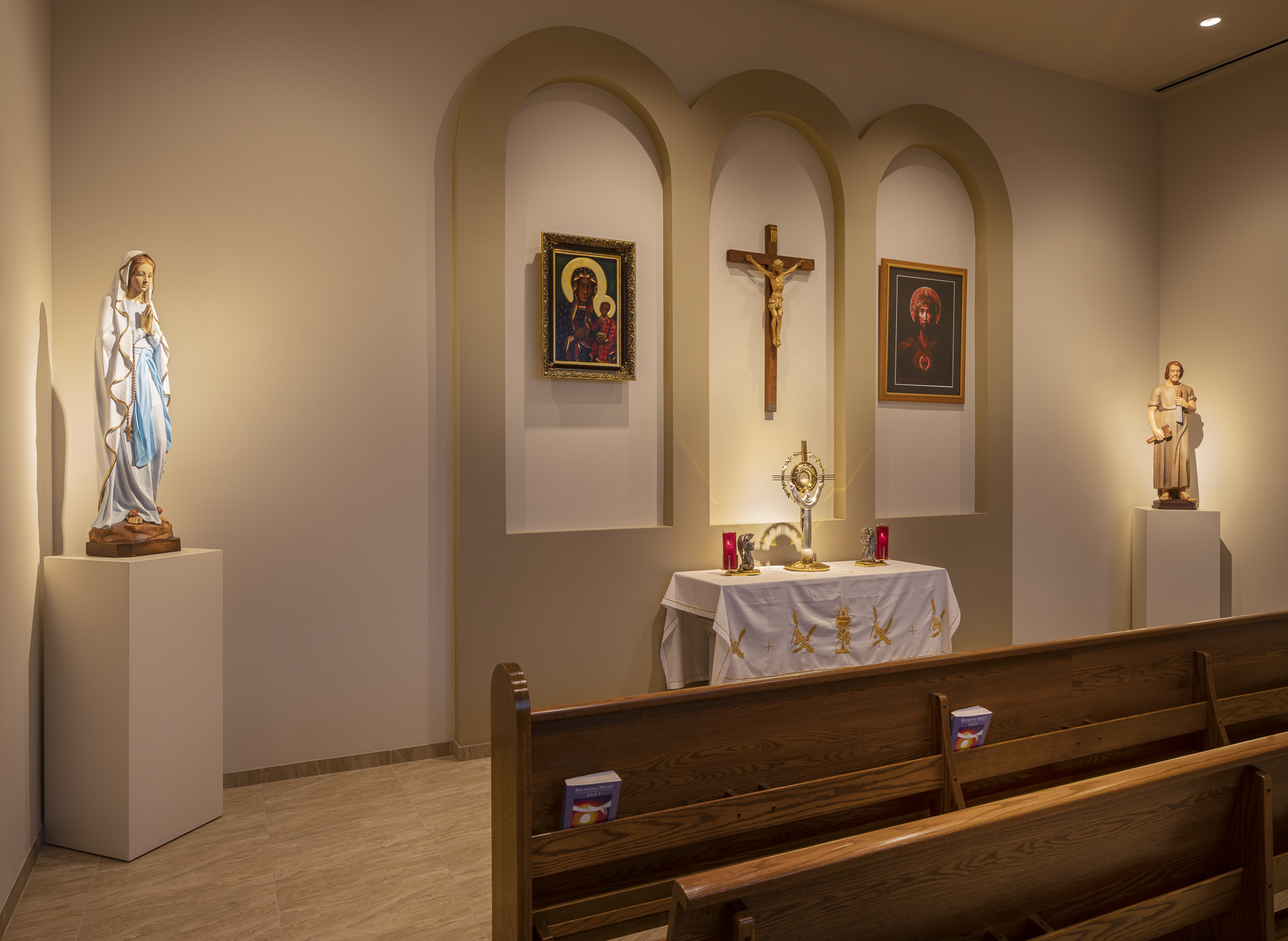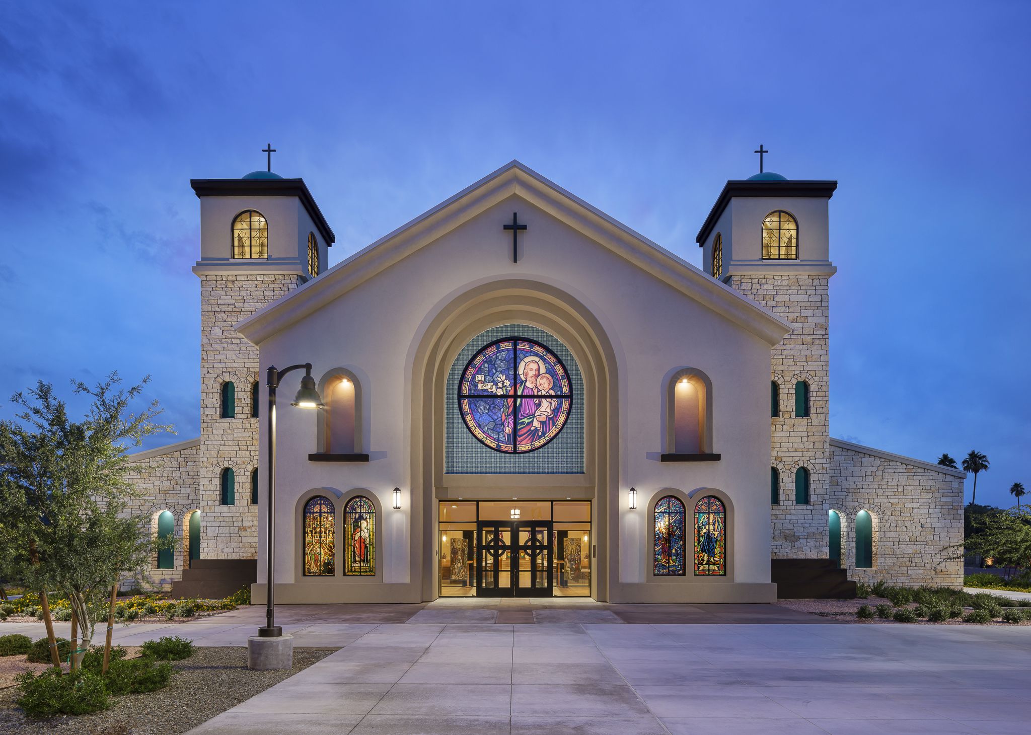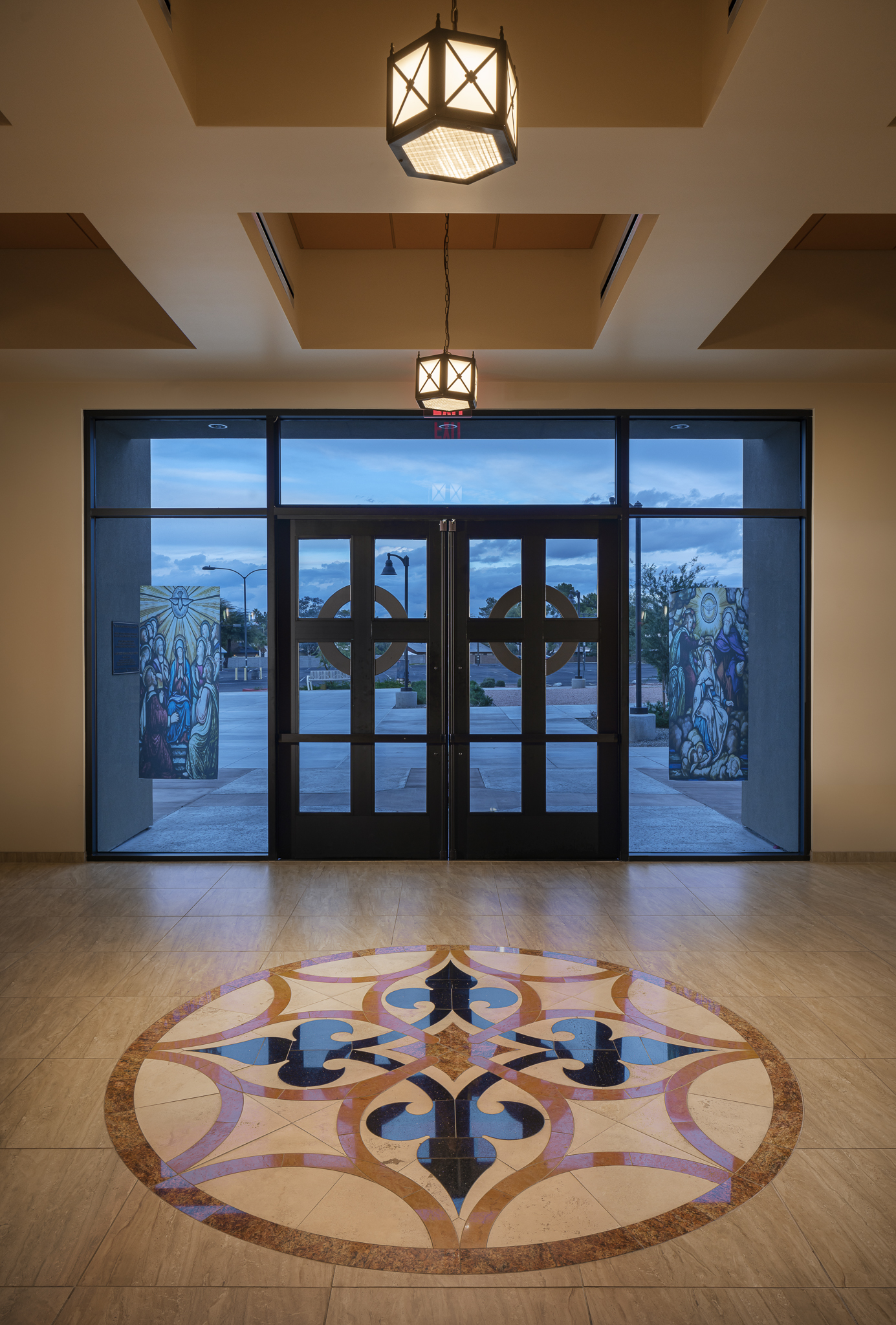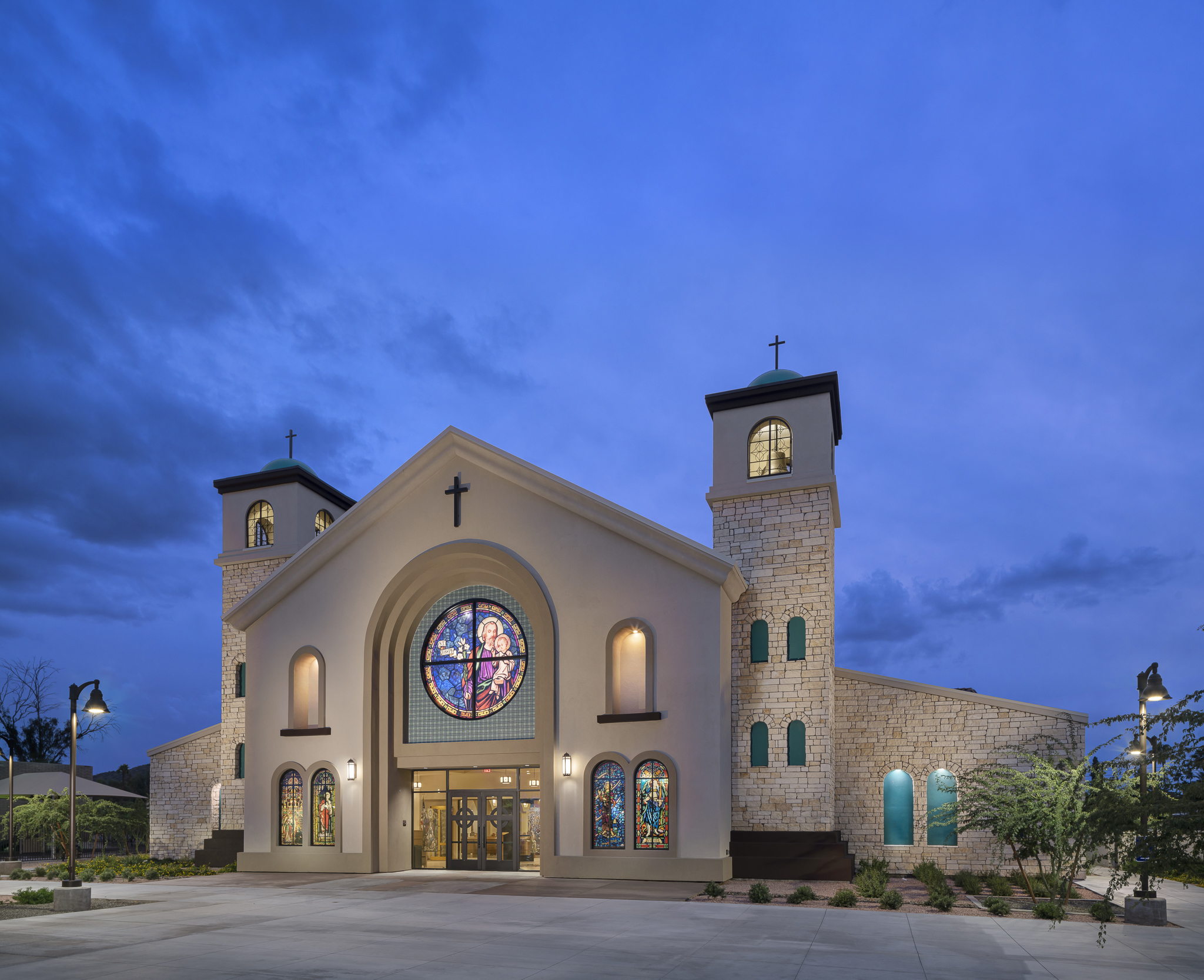 The main exterior finishes include EIFS (exterior insulating finishing system) and stone veneer applications. The color and materials palette that combines stone materials with a white base color and turquoise accent colors presents a Spanish Southwestern architecture that acknowledges both Catholic Diocese needs as well as our native Arizona environment.