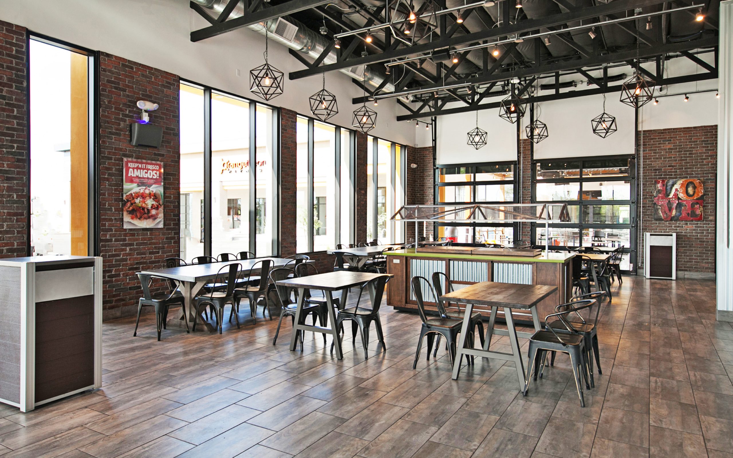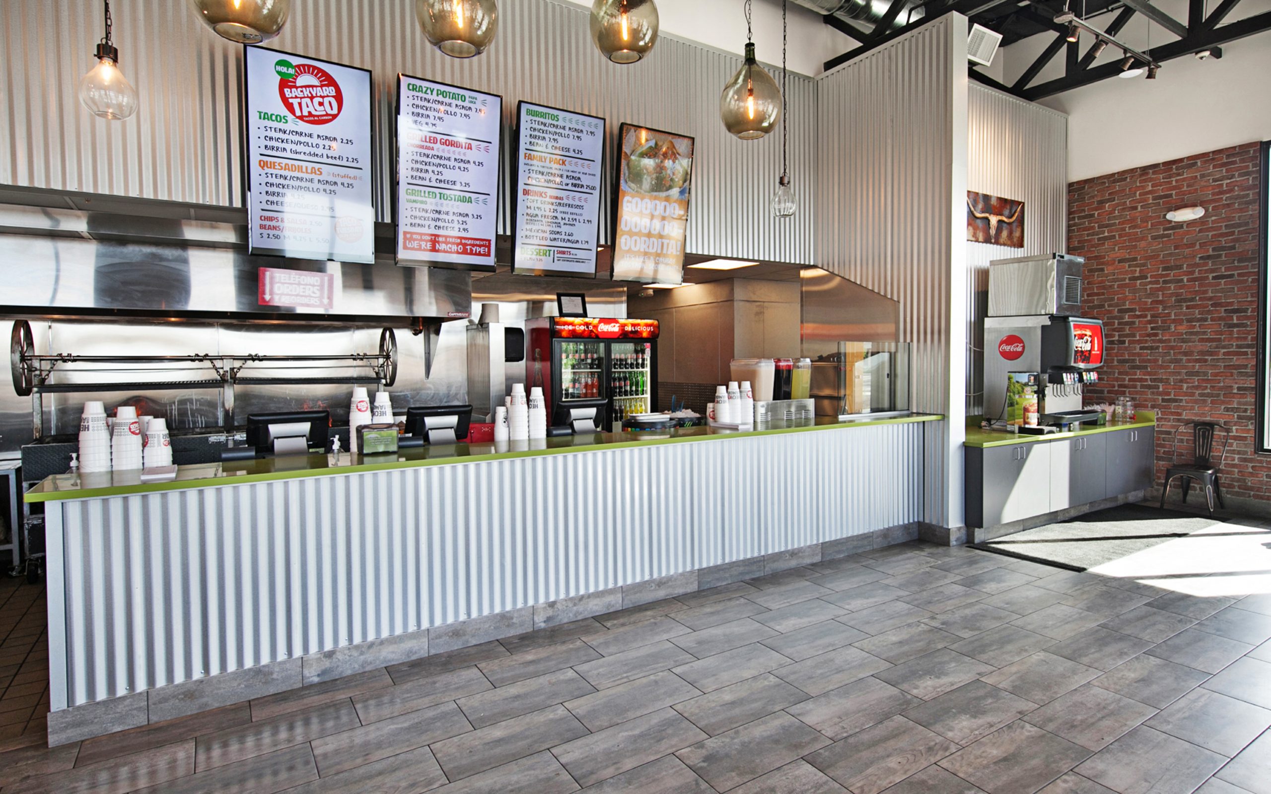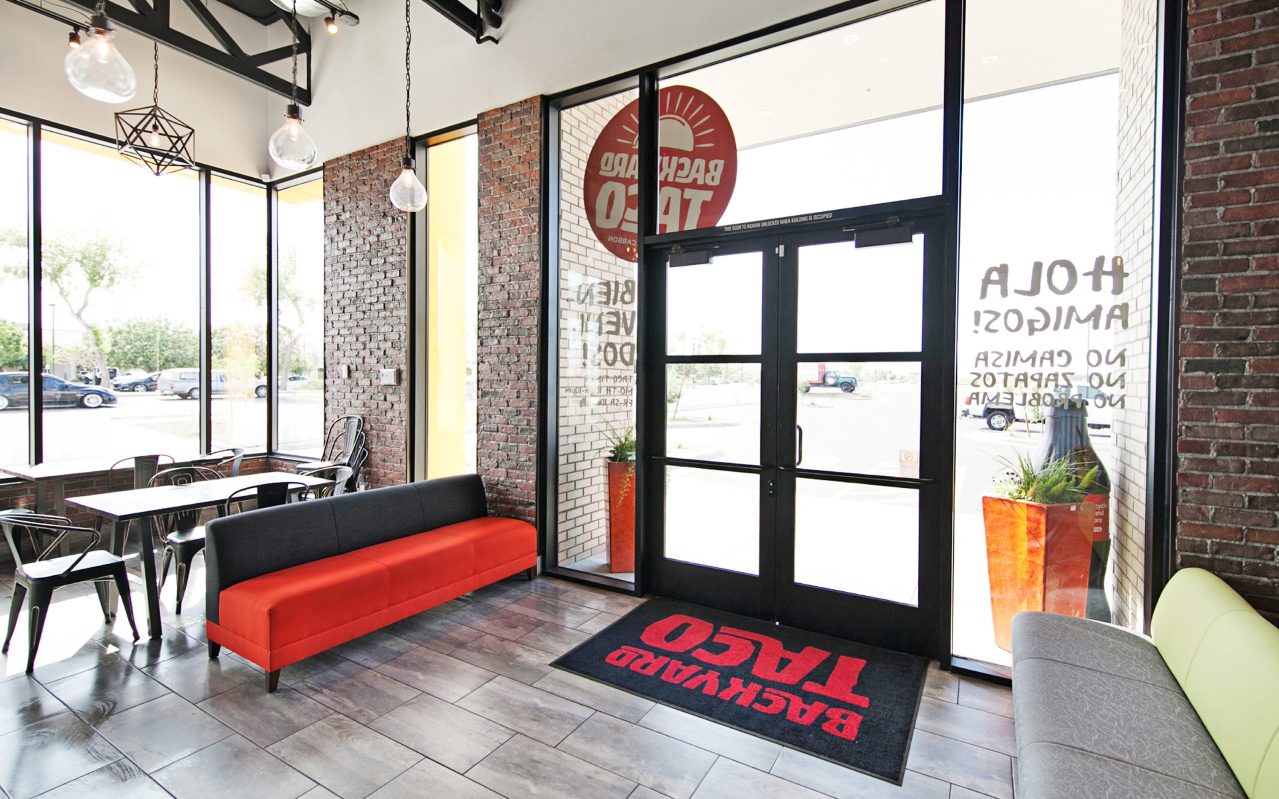 The Backyard Taco is a new ground-up construction building consisting of a full-service restaurant featuring indoor dining, full-service kitchen, appropriate storage, outdoor patio dining and exterior drive-thru lane. The building is designed to be an open floor plan for the indoor dining with views to parts of the kitchen and exterior patio space. The architectural character of the building is designed to be consistent with the existing site context, which includes a contemporary look with articulated façade treatments, varying parapet heights, and attractive color / material combinations. The outdoor patio dining area is one of the primary components of the restaurant and contains a steel structure canopy system to provide shade. The interior design of the building is also a contemporary approach that utilizes interesting raw materials and exposed elements of steel, metals, and brick applications.