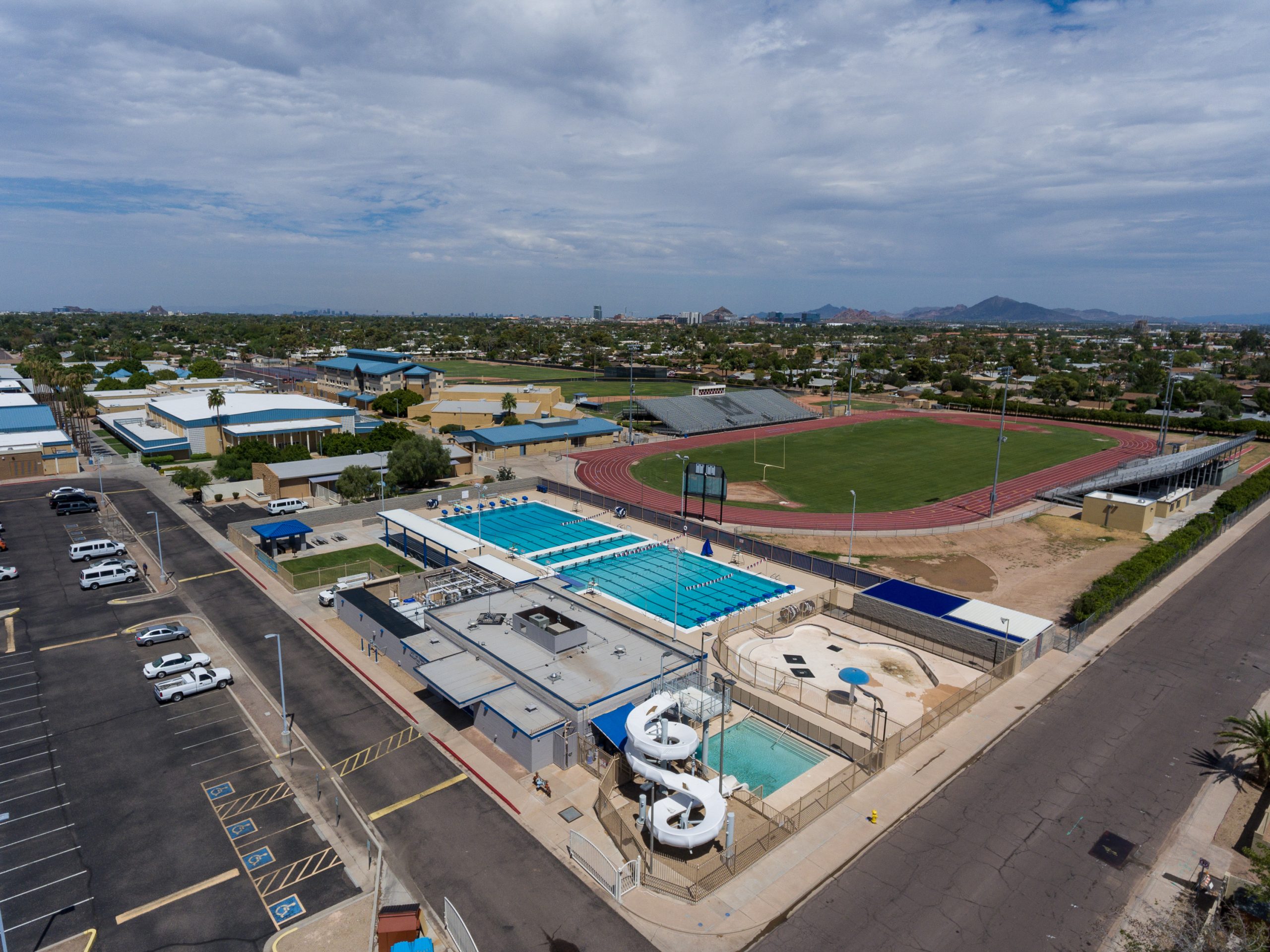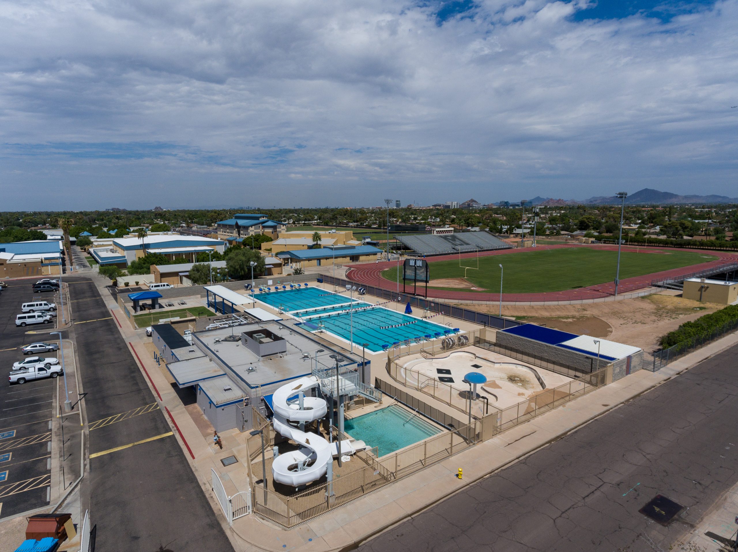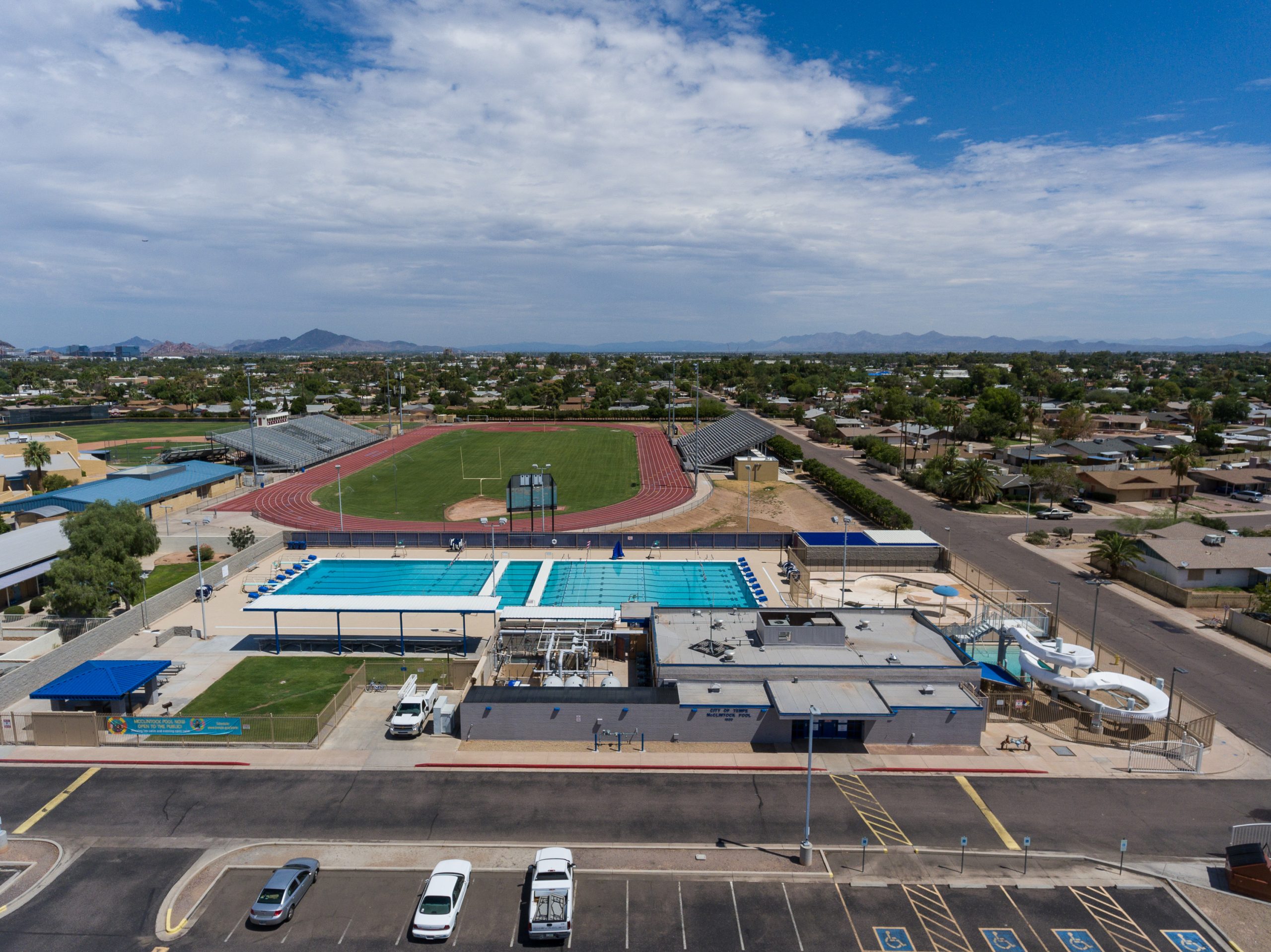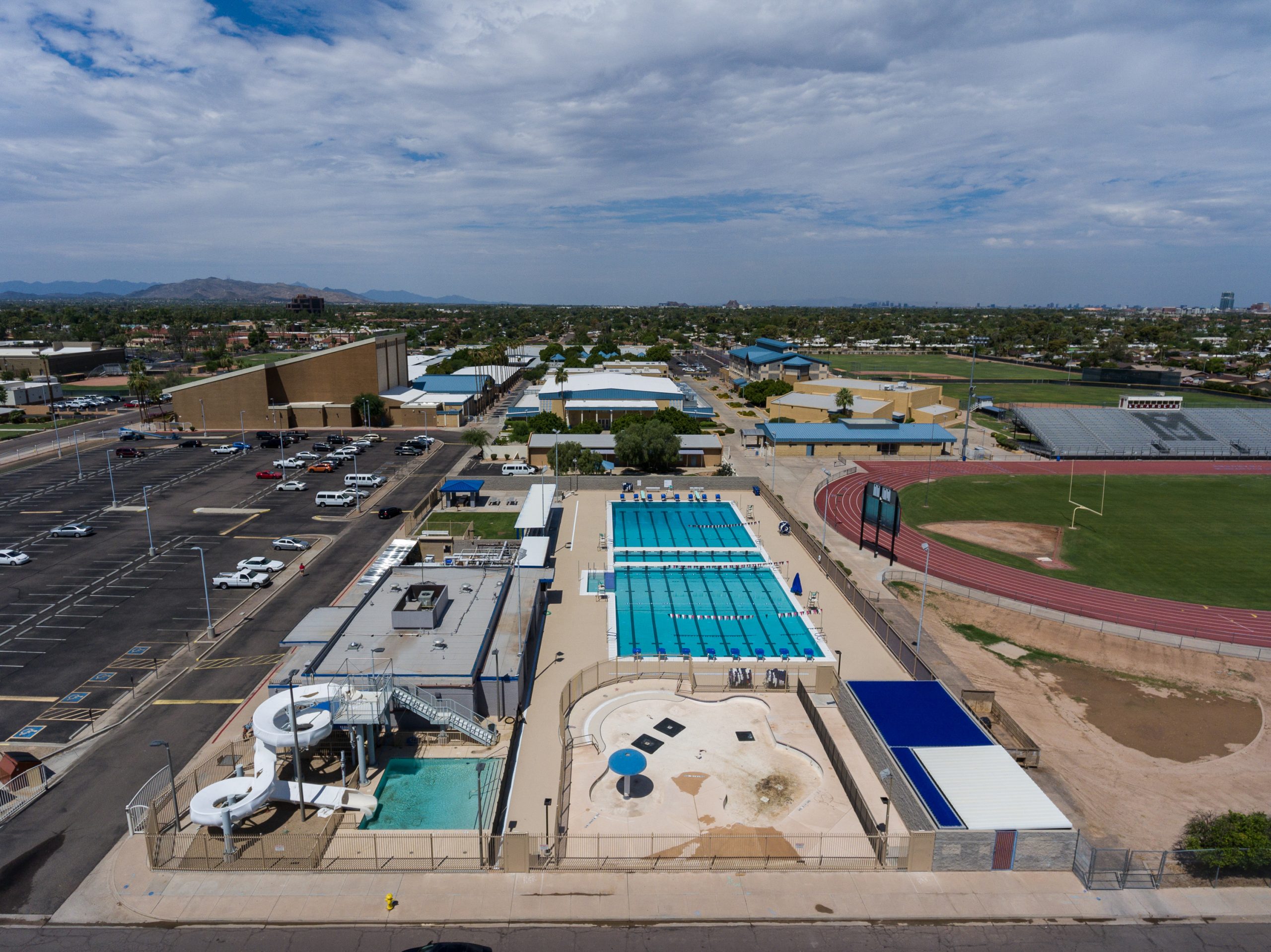 McClintock Pool was constructed by the City of Tempe on Tempe Union High School District property in 1964, and this competition and recreation pool served its neighborhood community, McClintock High School sports programs and local swim clubs for decades. Despite a remodel in 1996, maintenance and upkeep became an increasing challenge. And while the facility continued to be used for Tempe Schools physical education classes, swim team practice and competitions, by 2010 the condition of the pool prevented it from serving the public for recreational swimming until the necessary infrastructure improvements and pool renovations could be completed. In 2015 the city council approved funding to make the necessary improvements.
