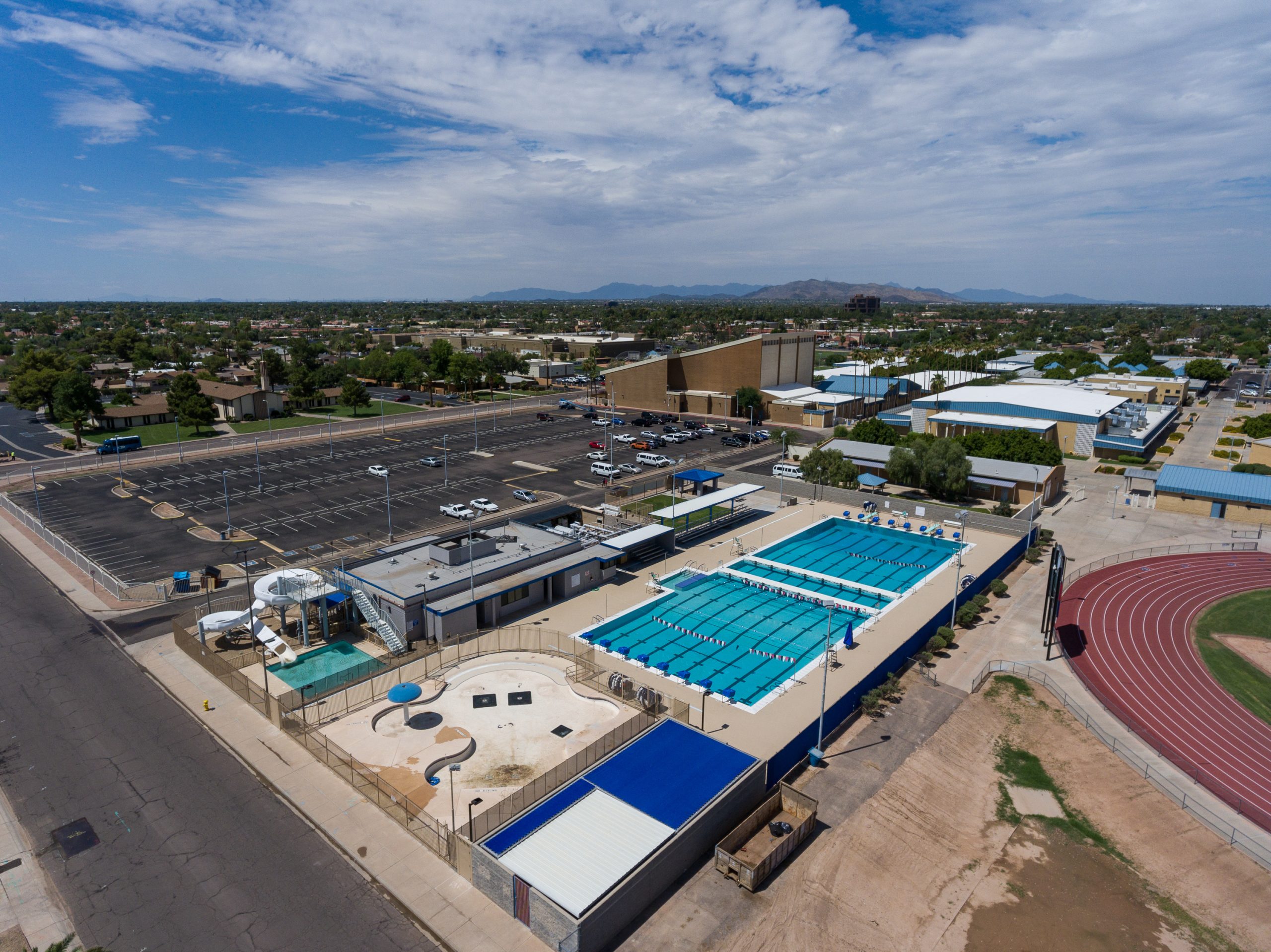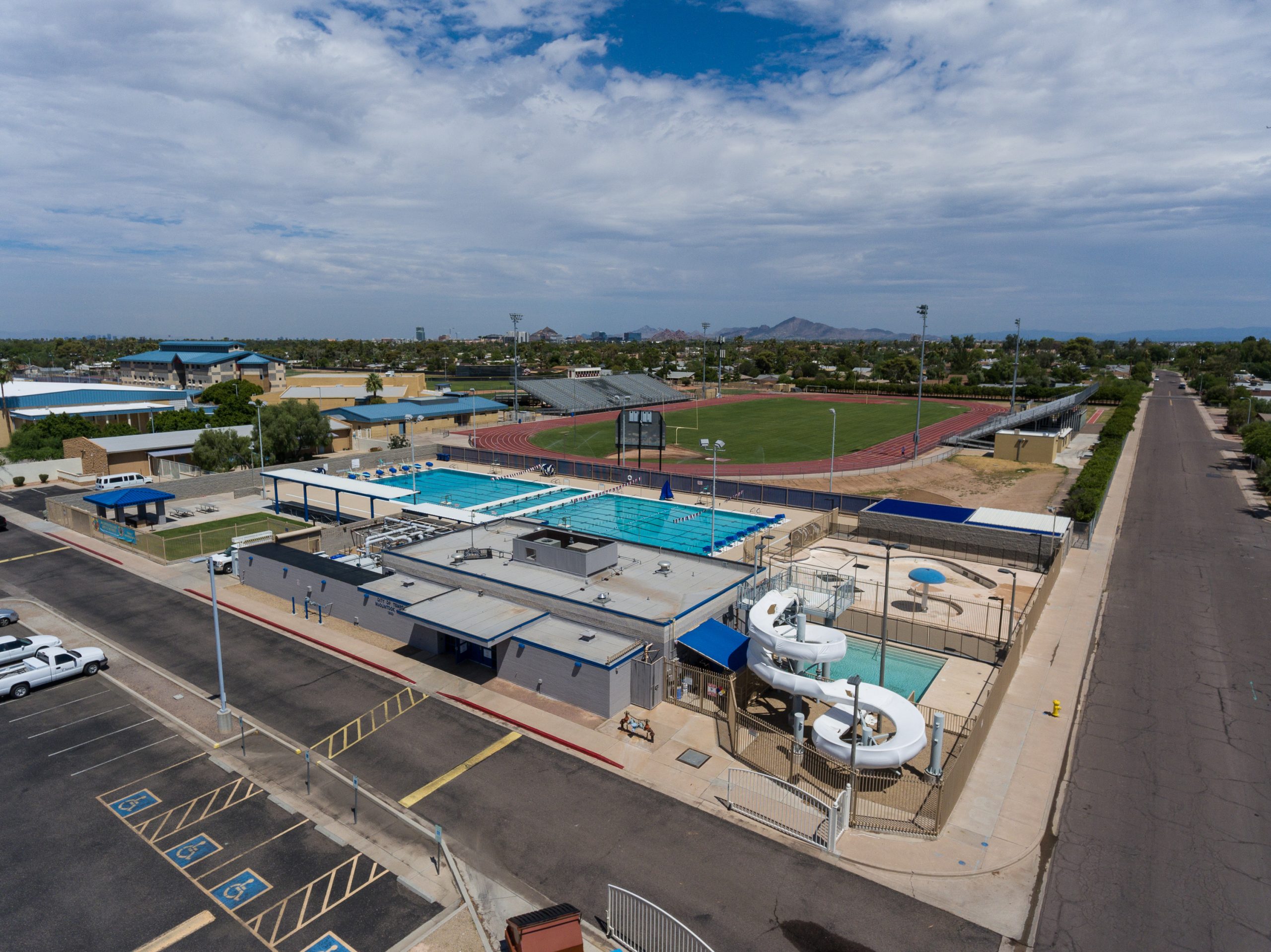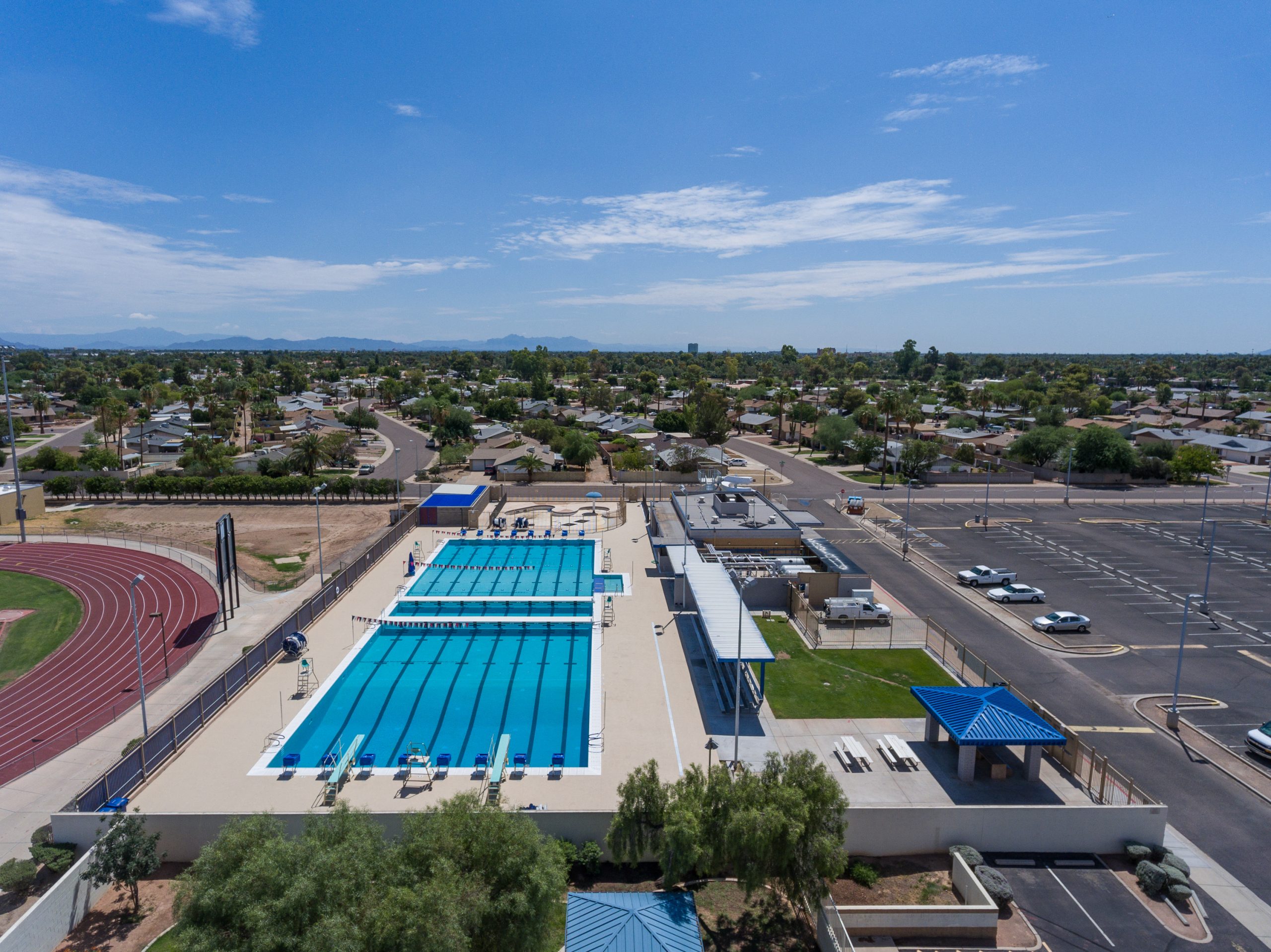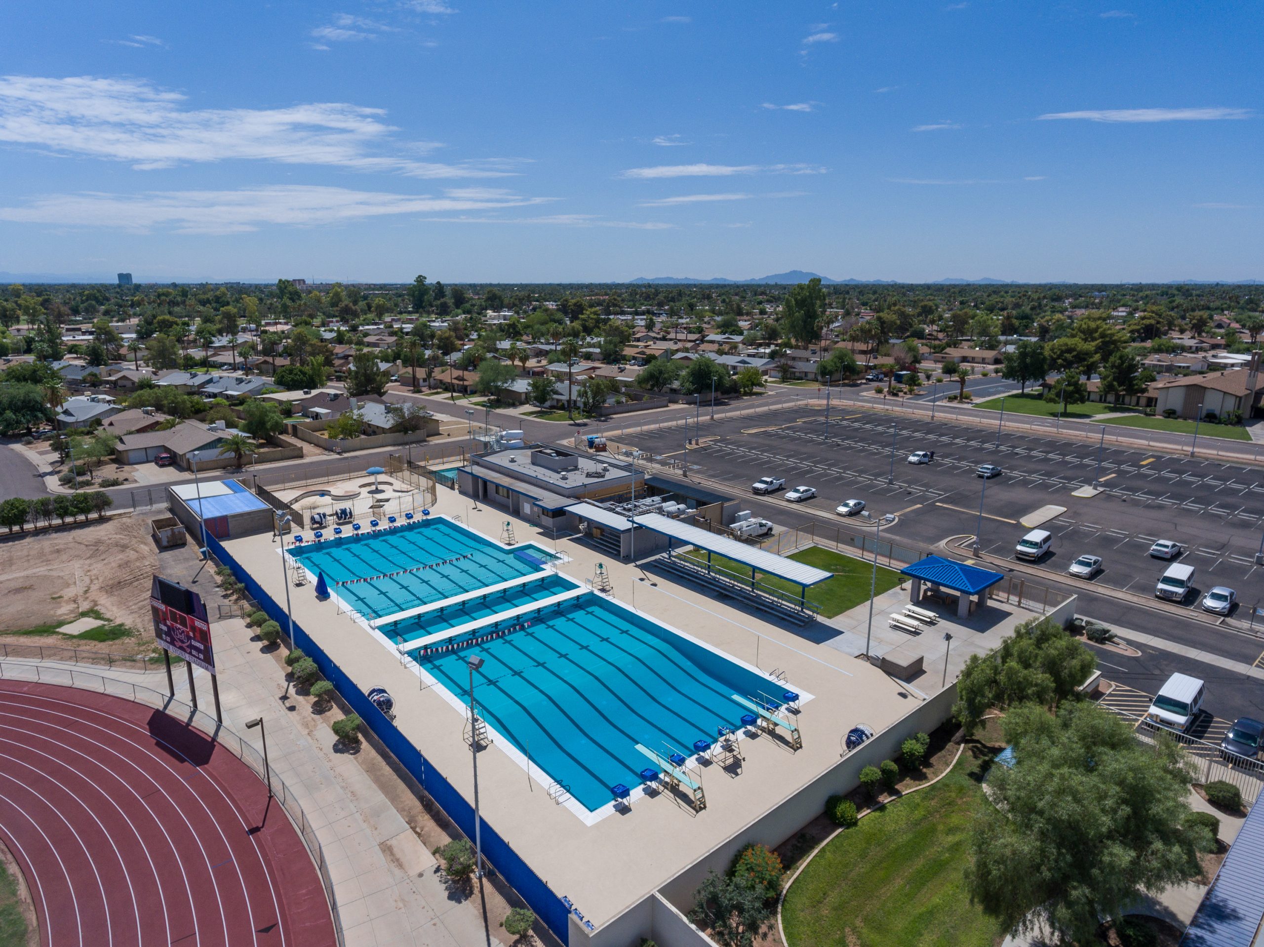 Adaptive Architects worked with the city on this partial demolition of the existing pool and construction of new eight lane, fifty-meter competition pool with movable bulkheads to allow an expansion of the programming opportunities. The remodeled pool was made deeper to meet the Maricopa County Department of Environmental Quality requirements for diving, longer to accommodate current standards for competitive swim meets, and a new ADA-accessible entrance was added to allow use by the entire community, regardless of their abilities.