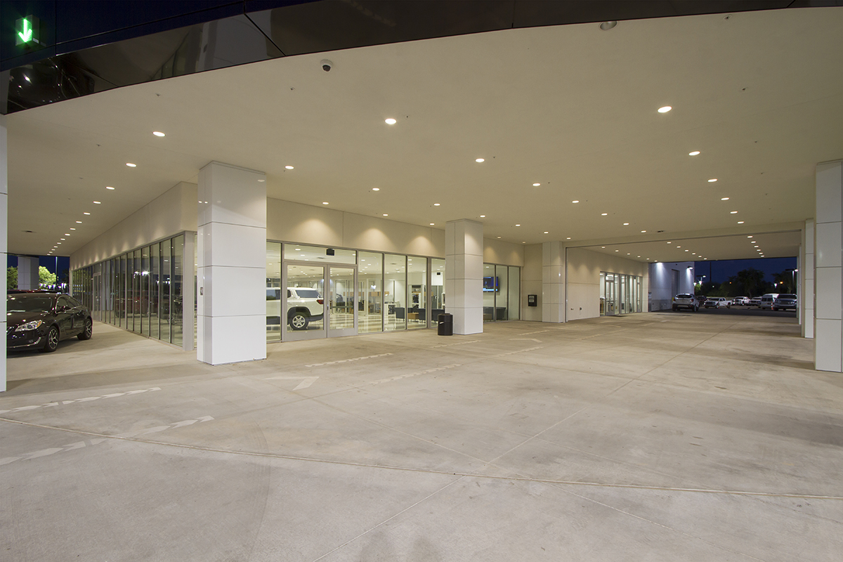 The building design features a contemporary style of colors, volume and materials. A series of columns create a curved archway at the front elevation along the east exposure, providing shade, comfort, protection, and an intriguing design that helps identify the main entrance to the showroom and outdoor car display areas. A series of varied roof volumes define the functional aspects of the building to align with existing dealerships. A synthetic finish system is used at most exterior walls to match the existing facility in texture and colors, while an exposed masonry wainscot is minimally used as an accent. The curved archway element at the front of the showroom contains aluminum composite panels at the top portion of the curvature, and the columns feature a synthetic finish system.
