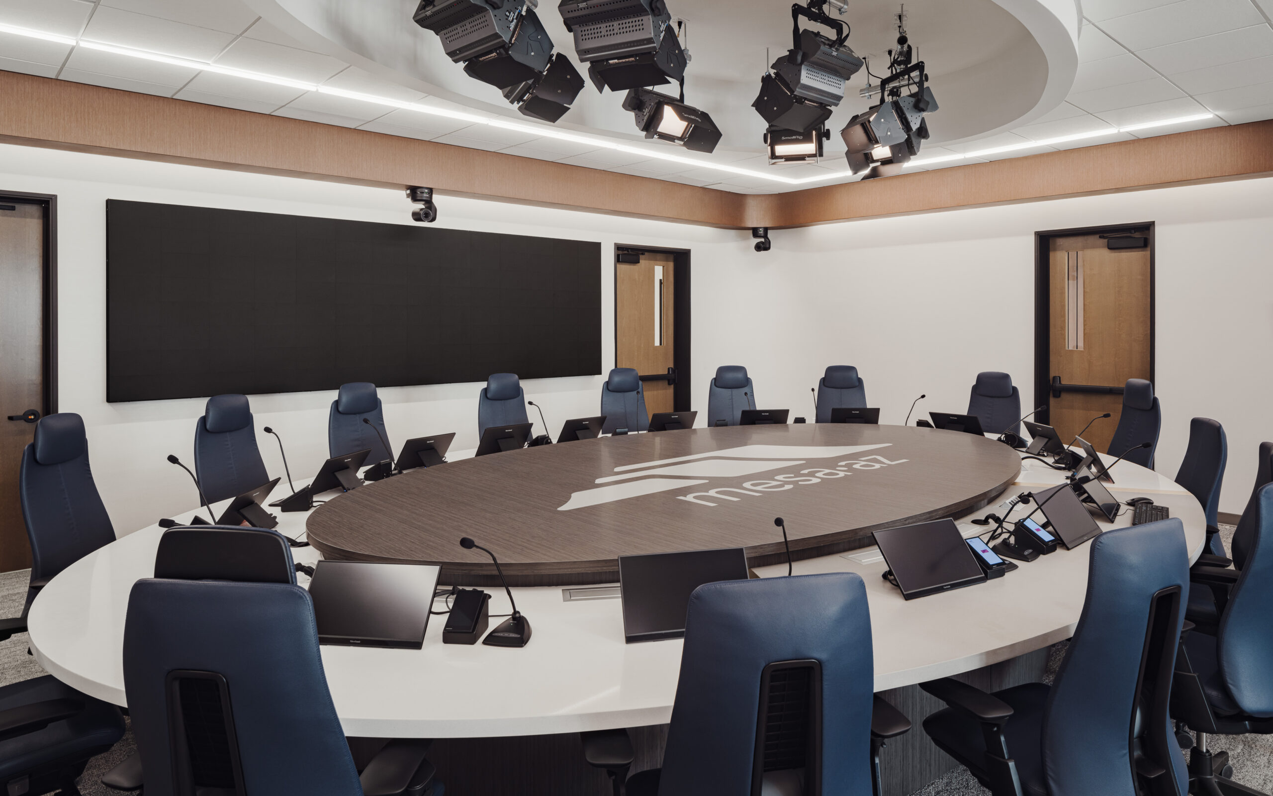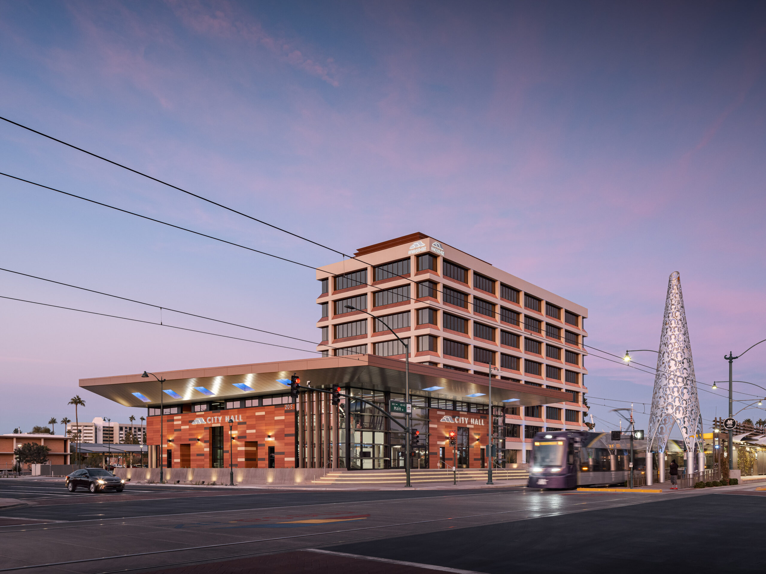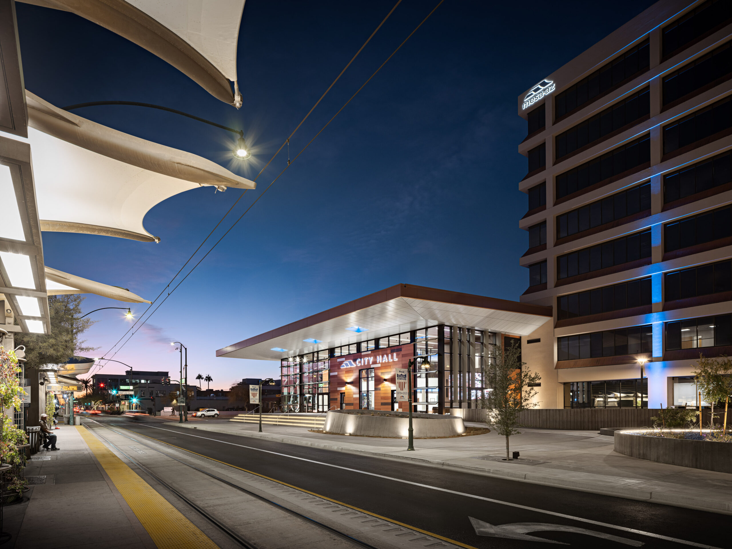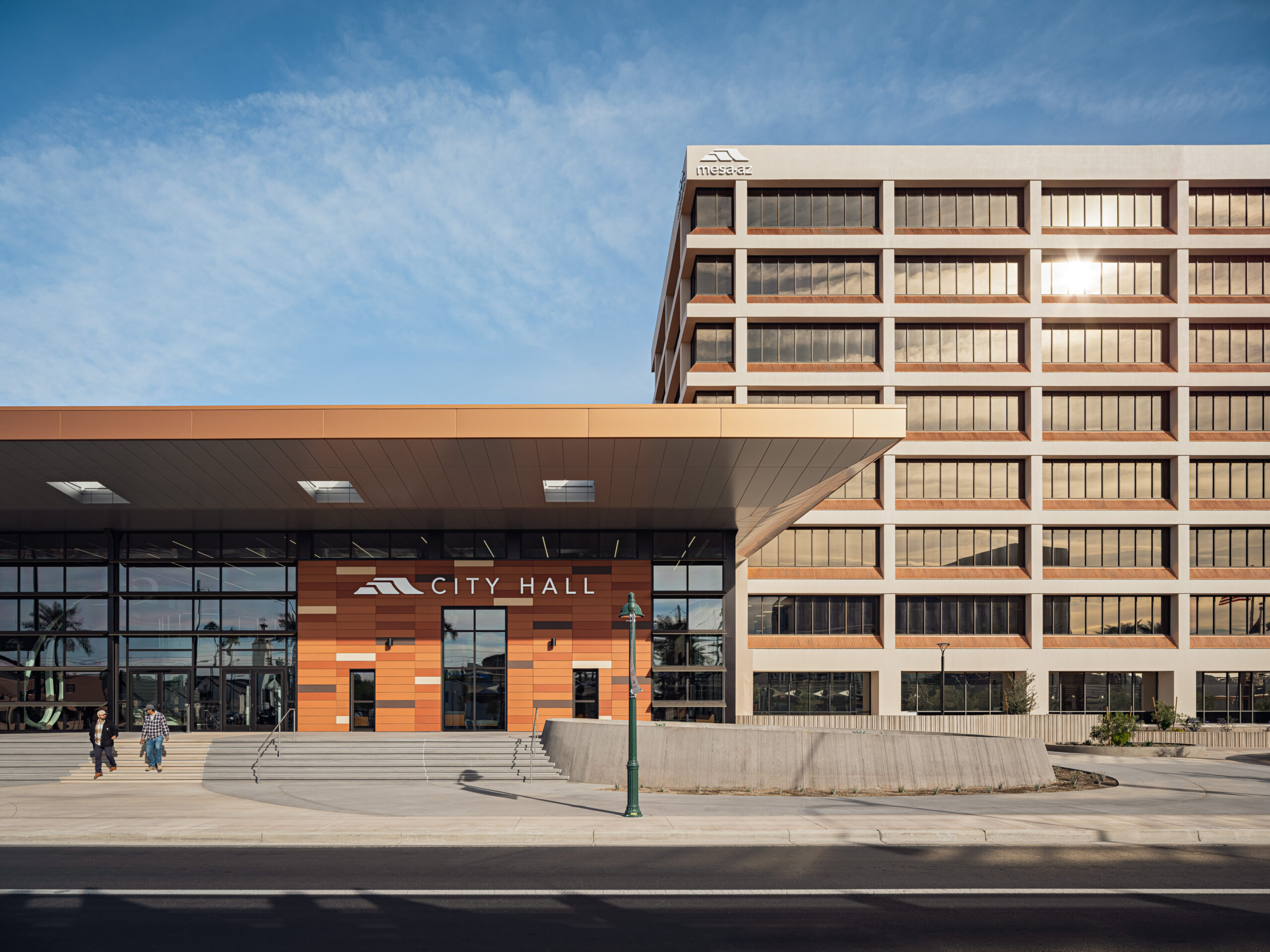 The Mesa City Hall and Council Chambers expansion design is based on the idea that government should be transparent and visible to all citizens. With tall windows and a centralized location, the city council will sit at a level in which anyone walking down Main Street will be able to look inside and see the city council in action.