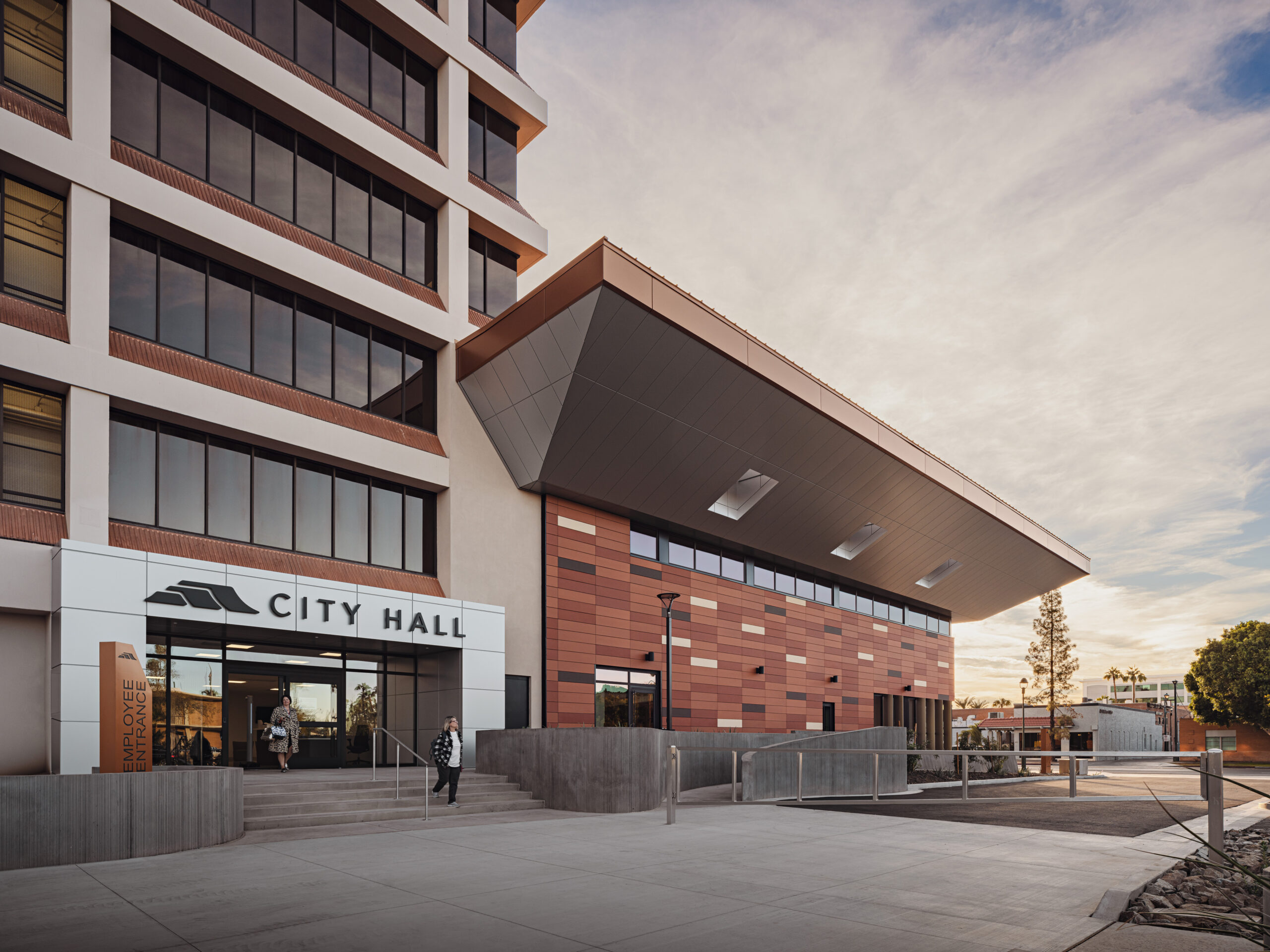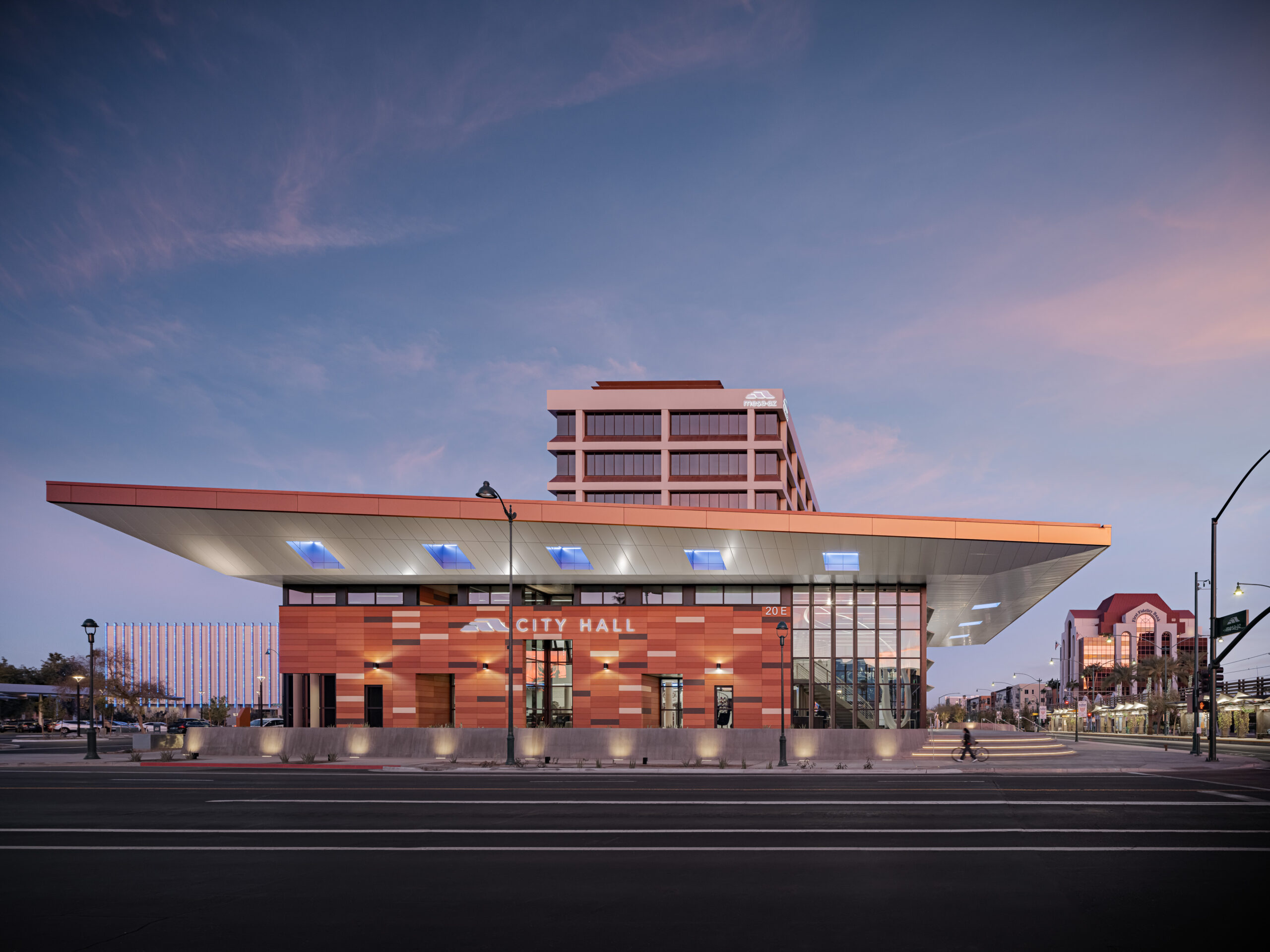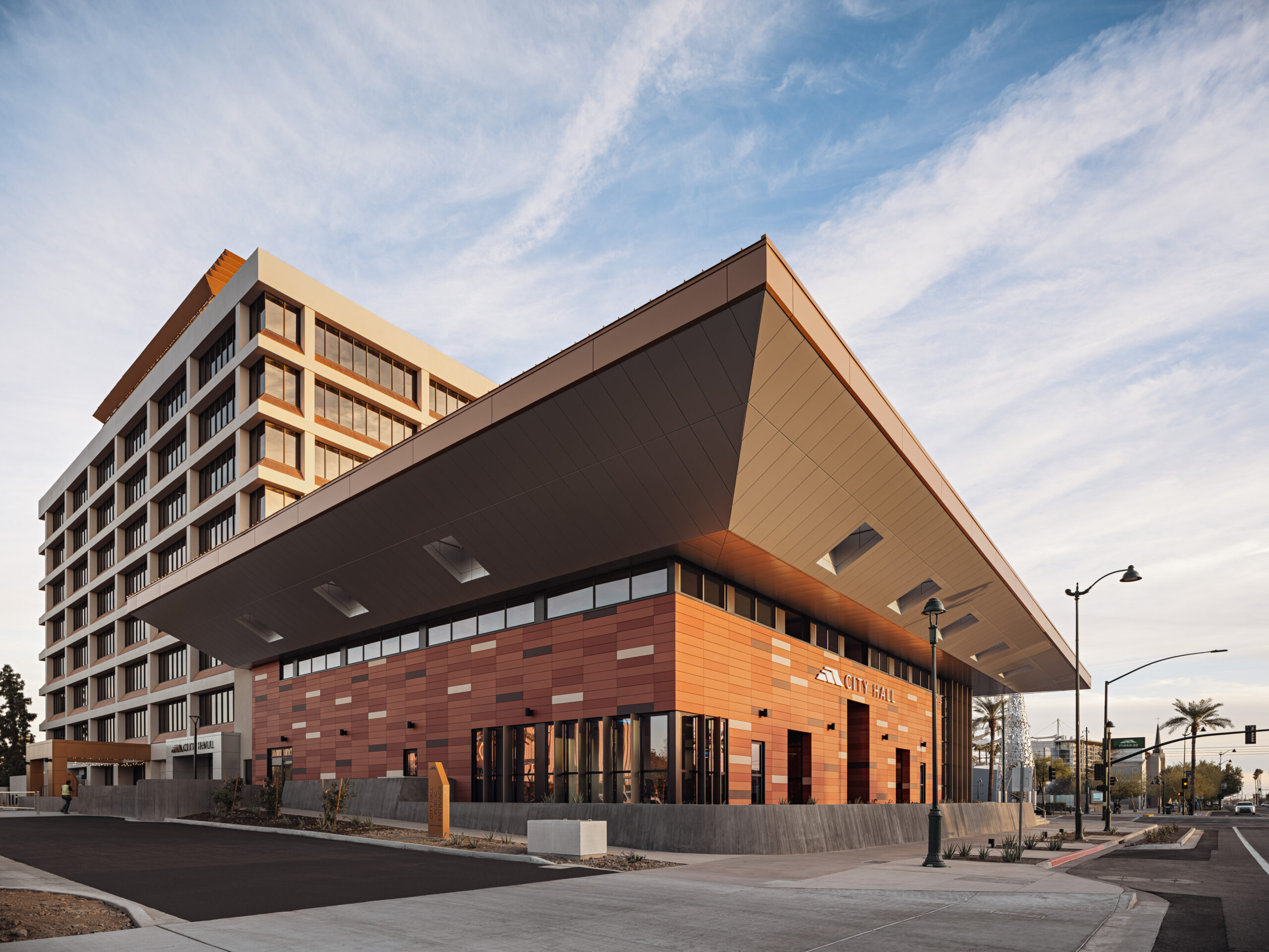 Desert tones and materials are featured throughout the project in a way that makes the building feel like a new, invigorating space while also making it feel like it has always been there. The exterior walls are clad in natural terracotta, recalling the brick tones of historical Mesa buildings while also providing a thermally isolated system to help prevent heat from entering the building. A large sloping roof overhangs the south and west facades to shade the tall glass. The roof will be finished in a low-gloss, copper-tone standing seam metal system. In the center of the roof, the council chambers pop through, glowing like a beacon.