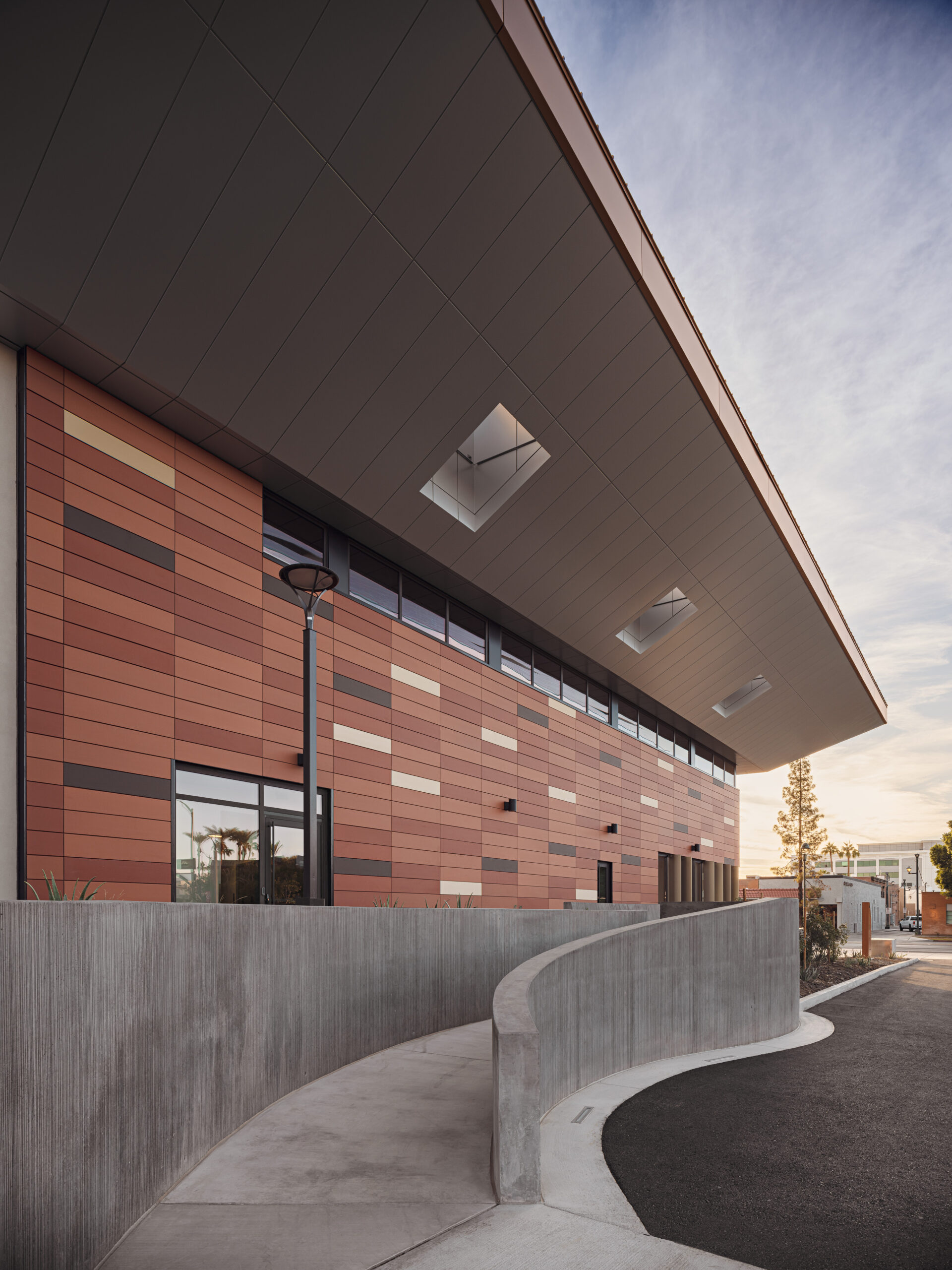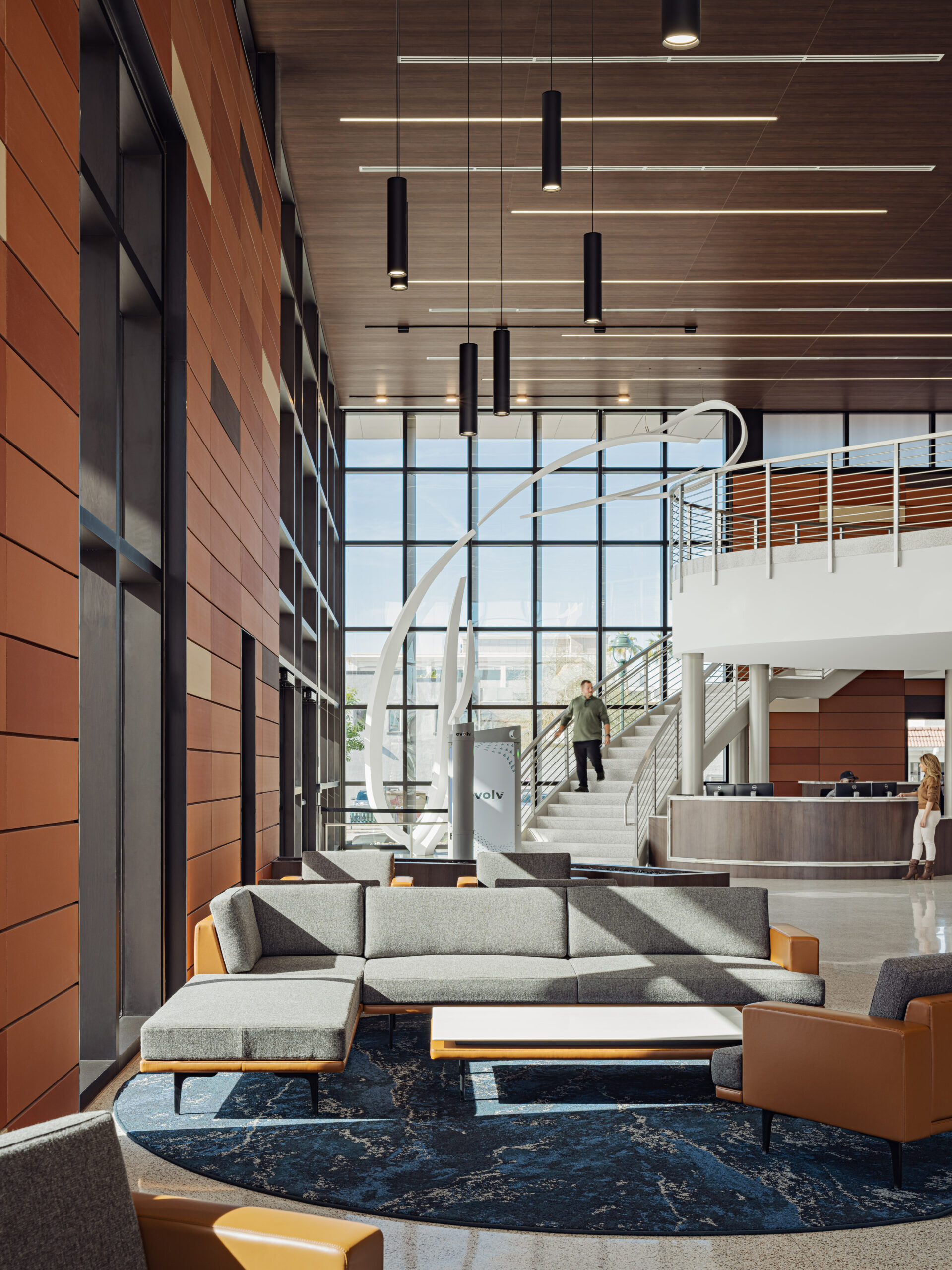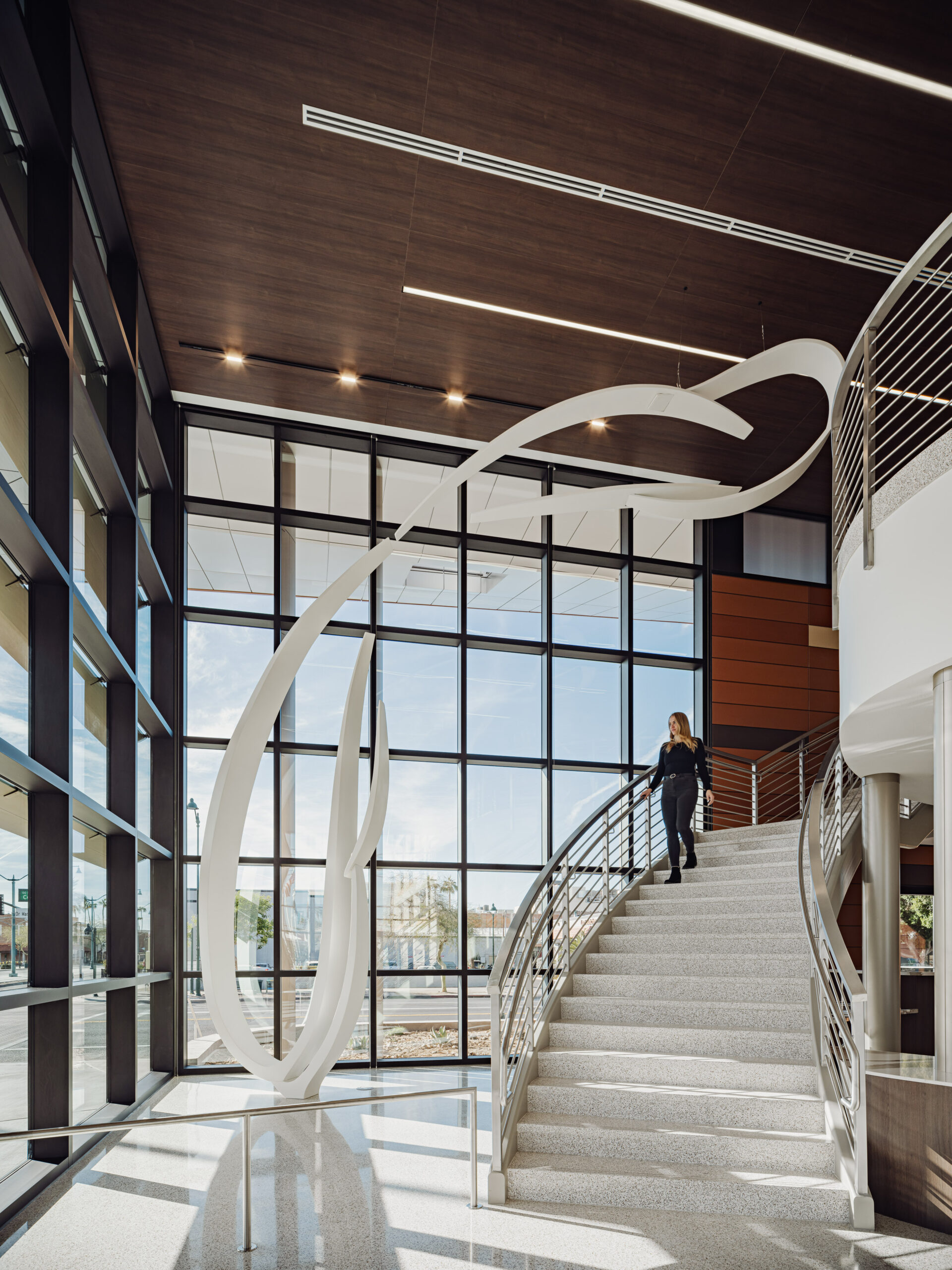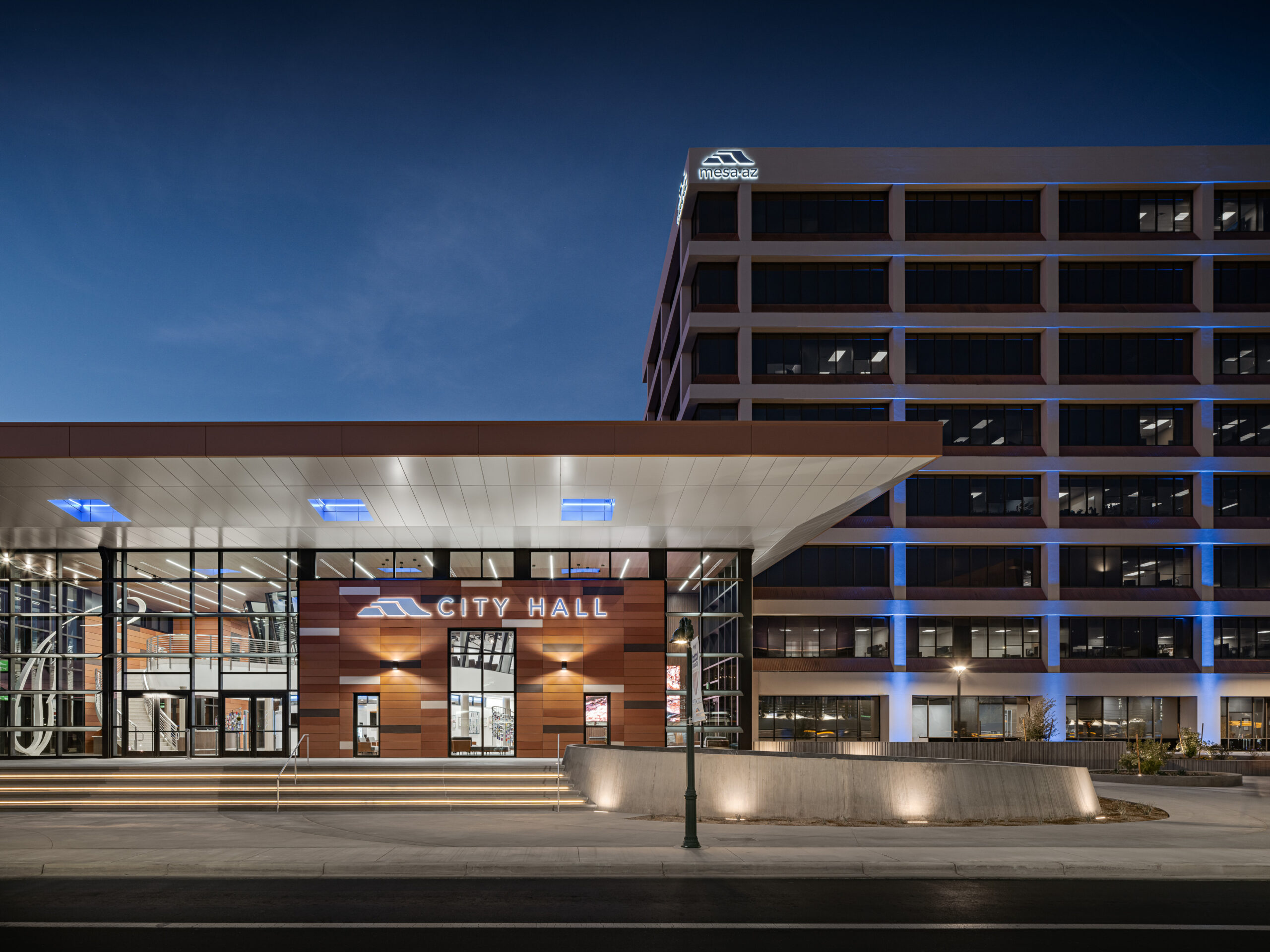 Desert tones and materials are featured throughout the project in a way that makes the building feel like a new, invigorating space while also making it feel like it has always been there. The exterior walls are clad in natural terracotta, recalling the brick tones of historical Mesa buildings while also providing a thermally isolated system to help prevent heat from entering the building. A large sloping roof overhangs the south and west facades to shade the tall glass. The roof will be finished in a low-gloss, copper-tone standing seam metal system. In the center of the roof, the council chambers pop through, glowing like a beacon.