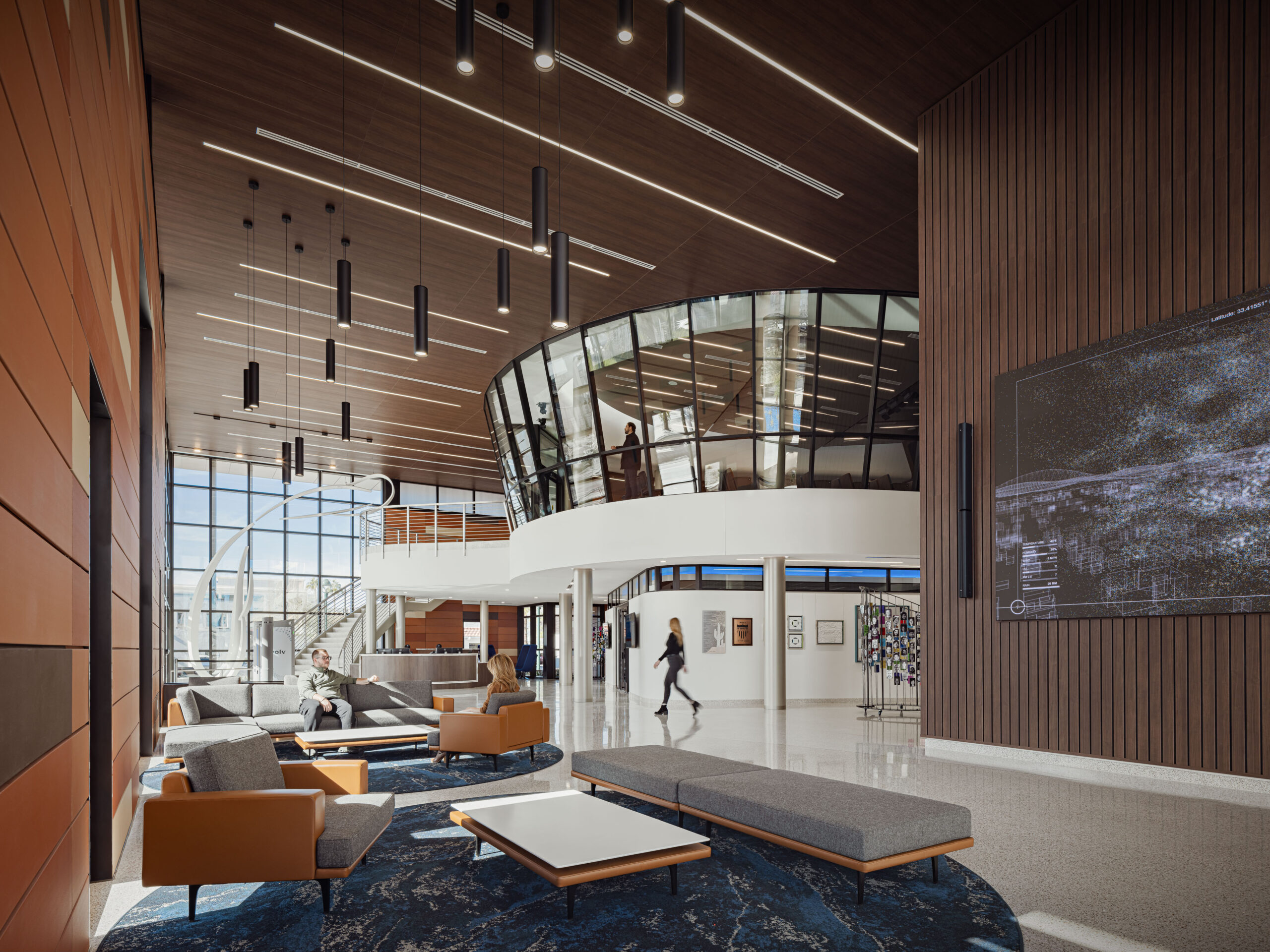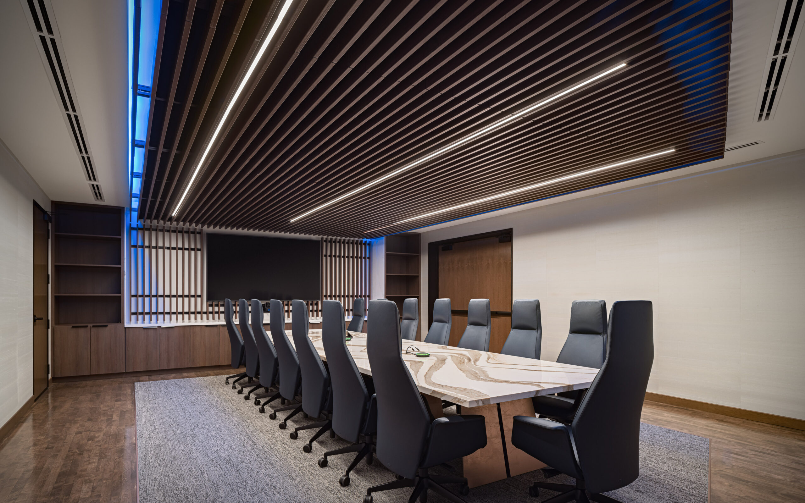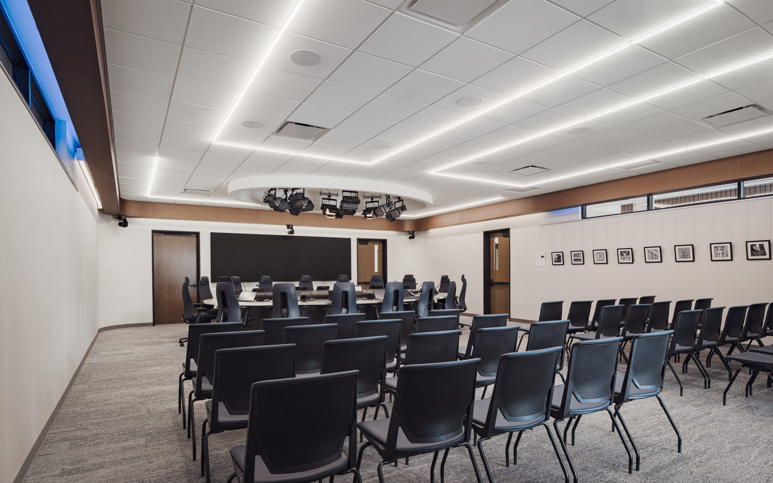 Visitors can access the second-floor chambers through the main staircase near the entry or the elevator located beyond the reception desk. The council chamber has been designed to provide a sense of openness and accessibility throughout the day and night. A curved soffit, held up by brass-toned columns, creates a gentle and artistic way of bringing natural light into the chamber. As the sun sets, the cove light above emits a warm and inviting glow, becoming a beacon of light for the city. Artfully angled panels host both lights and speakers, carefully situated to provide optimal acoustics and aesthetic appeal.