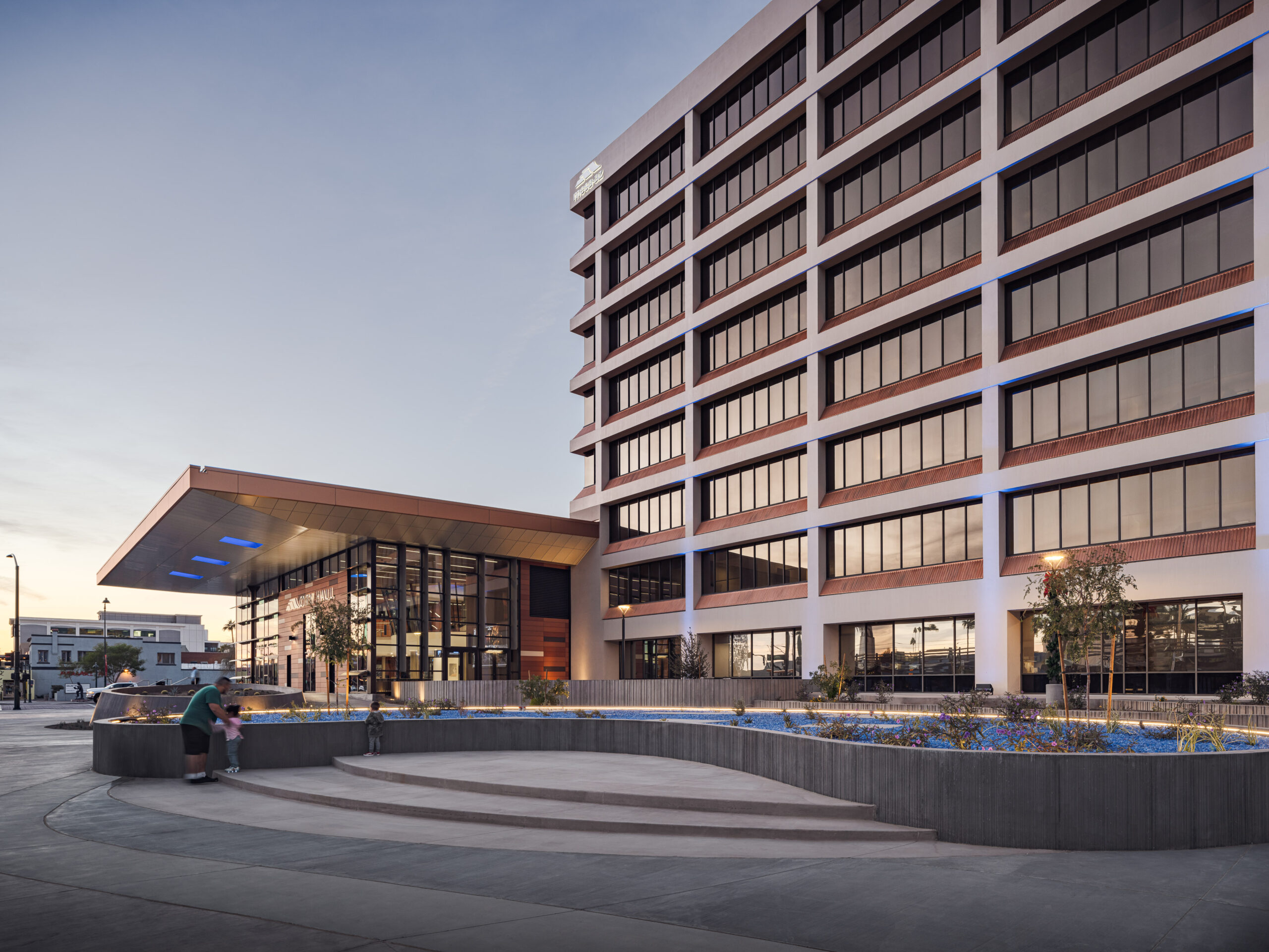 To further enhance the connection to downtown, the existing plaza located south of Plaza Tower will also undergo a revitalization. This newly reworked plaza not only serves as a unifying link but also offers a sensory experience to those who cross it. As visitors weave their way through the creosote shrubs and cholla groves, they’ll encounter mounds of textured concrete, shaped like barrel cacti, forming planters that blend effortlessly into the sidewalk and lead to the front entry.