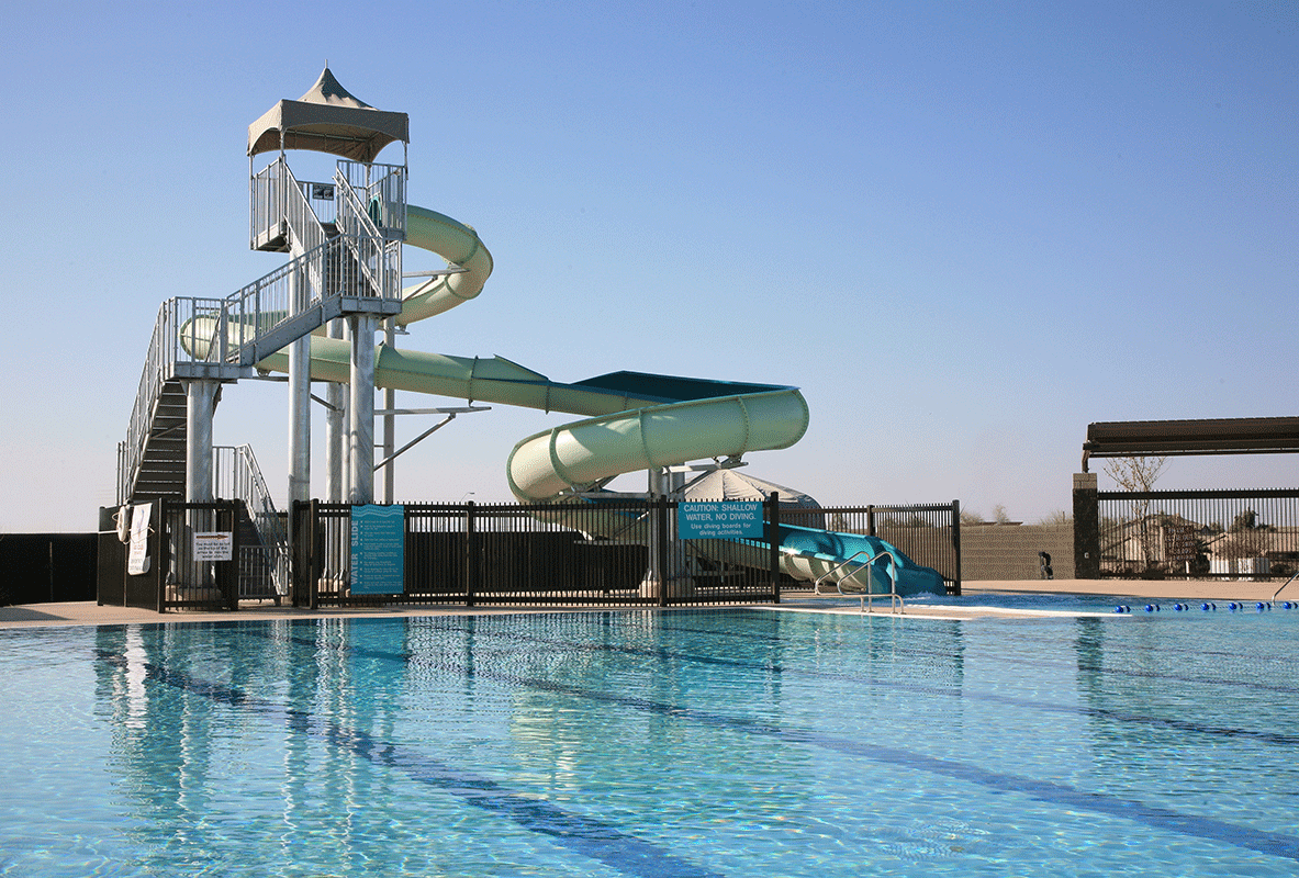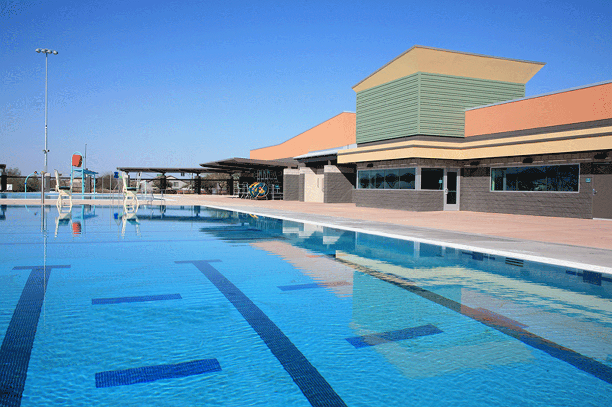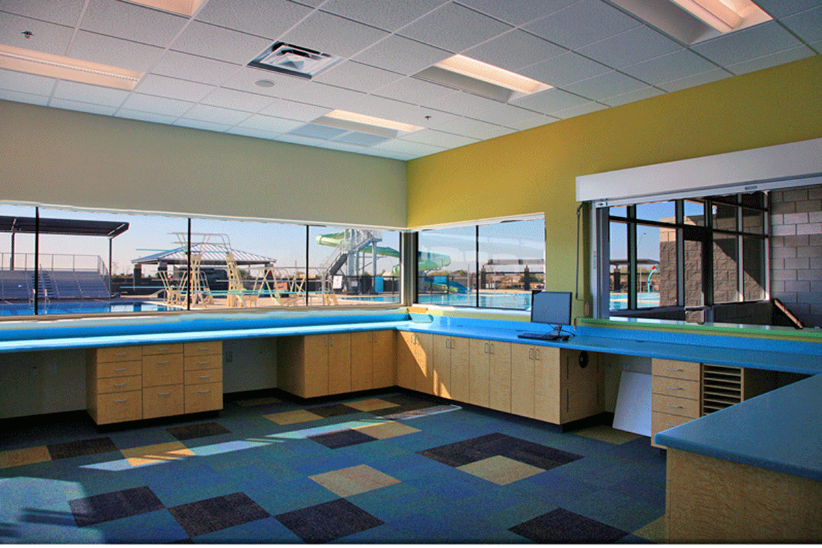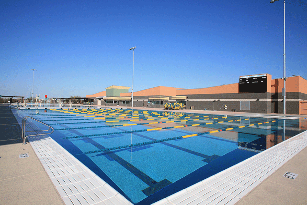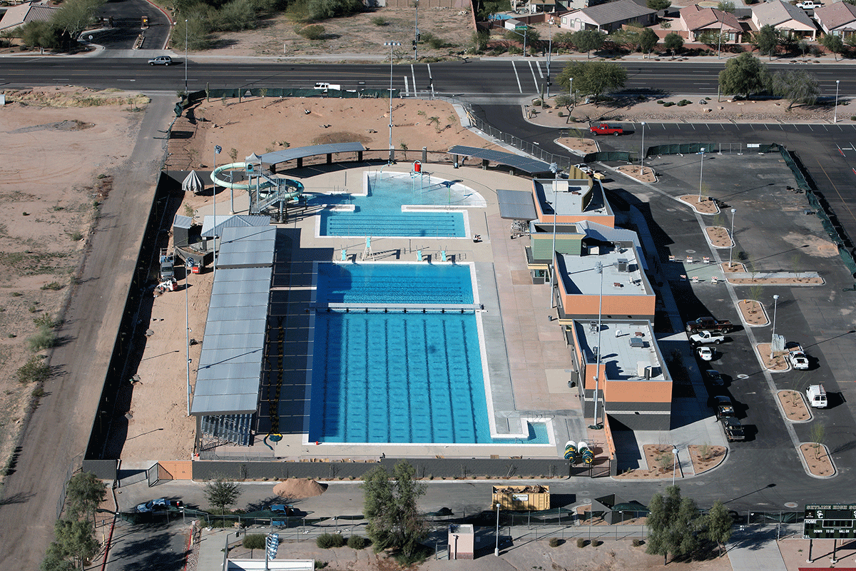 The recreational pool consists of a beach entry with large water slide, play accessories and attached warm up pool for competition events. The competition diving pool is configured for both 50-meter racing lanes and 25-yard mixed course lanes. The pool functions are supported by two adjacent one story buildings housing a bathhouse, lifeguard facilities, classroom and office space. While these buildings were required to be highly efficient and functional, the building forms are playful, drawing their inspiration from a modified wave effect that mimics water in building profile and layering of materials. The final design harmonizes with the existing school campus rather than merely duplicating the existing school buildings. Voted ‘Best of the East Valley’ 2016 by the East Valley Tribune.