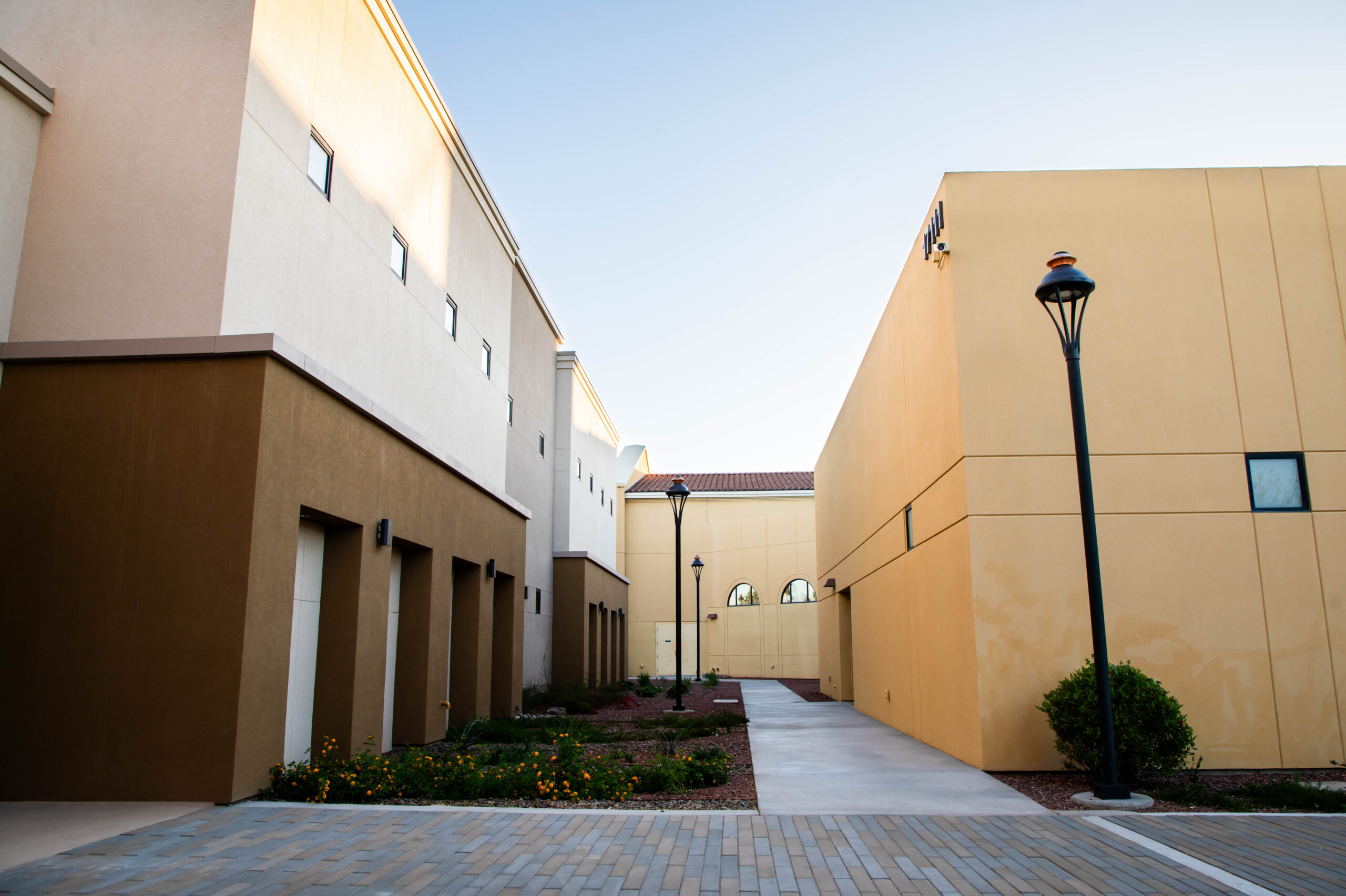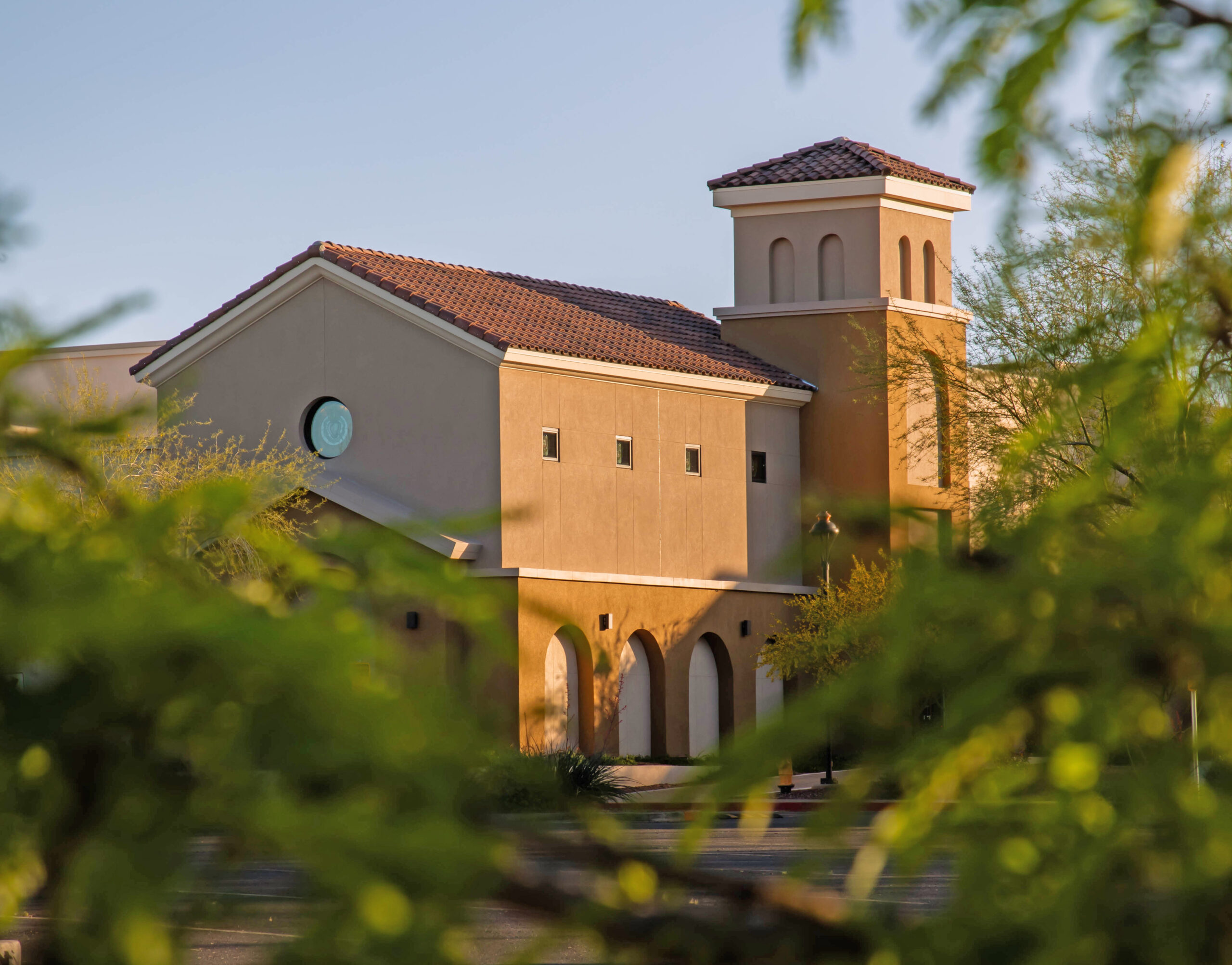 The design thoughtfully mirrors the architectural style of the neighboring church, embracing a Latin-American aesthetic. Key elements include Spanish tile roofing, a prominent tower, and archways that not only enhance the façade but also provide practical shading. The building’s overall form and details maintain harmony with the existing church, creating a cohesive and timeless campus.