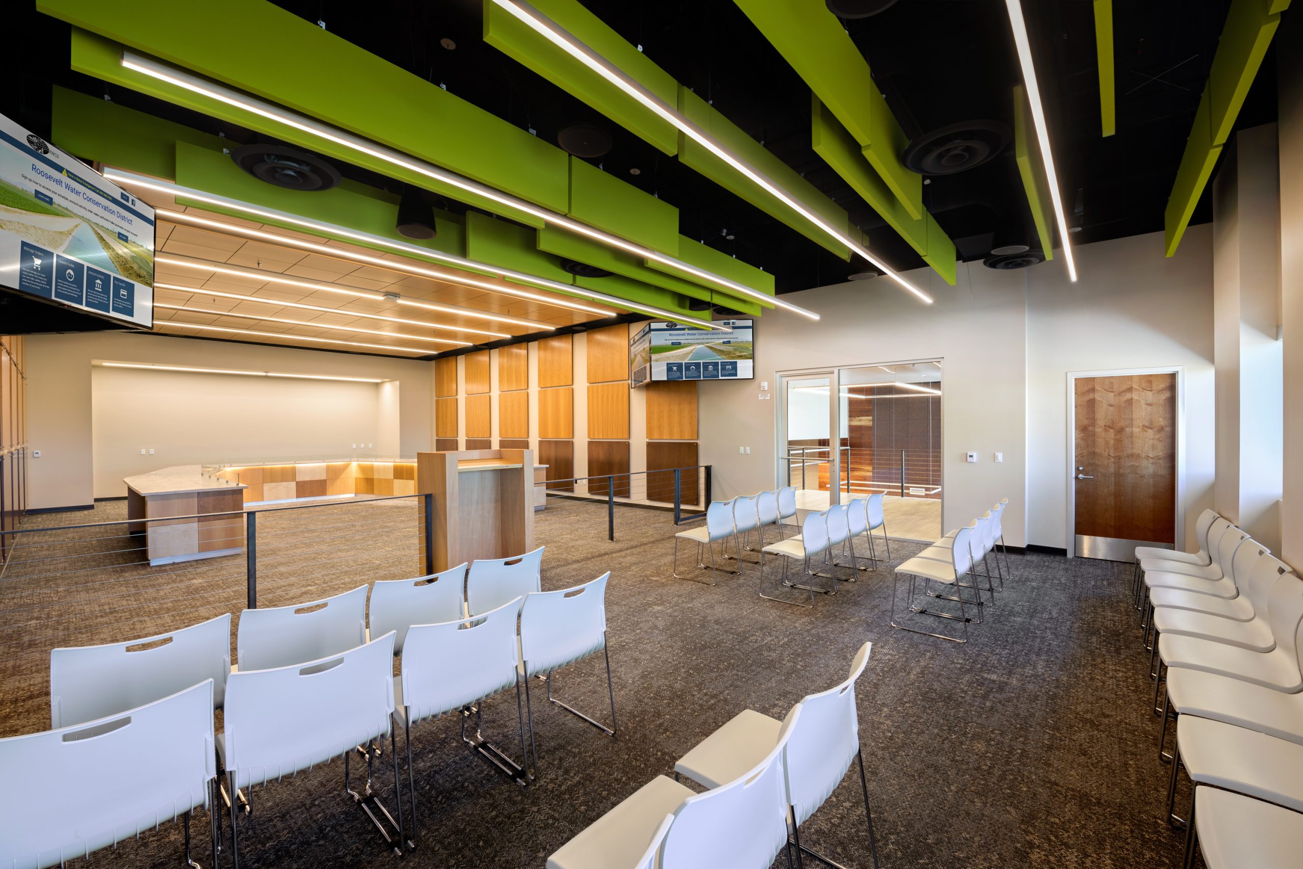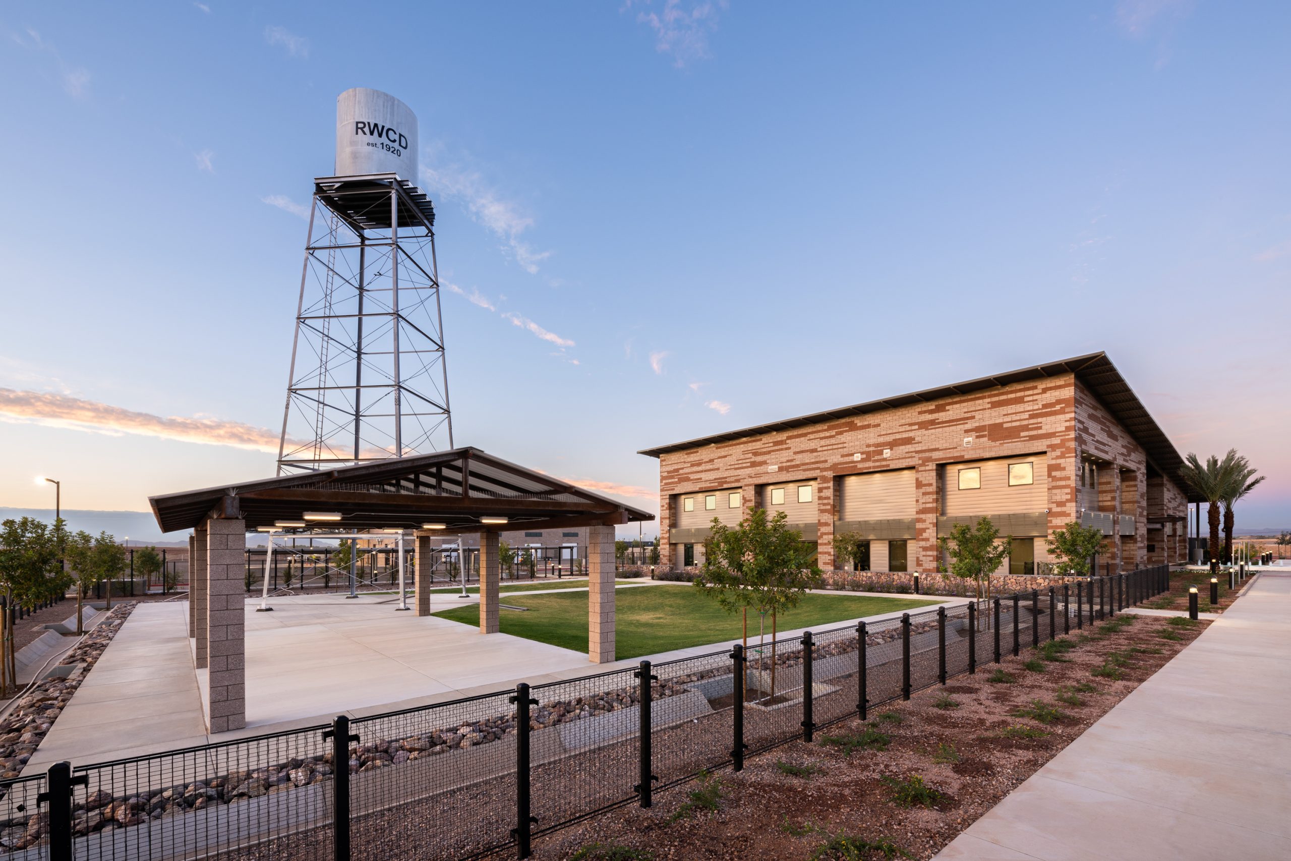 Additional on-site features include a new maintenance building that complements the main structure. This building serves RWCD’s equipment maintenance activities such as welding, carpentry, storage and also fleet vehicle maintenance, repair and supply storage. An outdoor storage area surrounds the maintenance building and provides access to the work areas for RWCD vehicles and tractor equipment, with entry controlled via secure vehicle gates. Adaptive also worked with RWCD to develop a new “legacy park” that is available on-site as well to host educational programs for elementary school students. This unique amenity honors the rich history of the organization, and features historic relocated tower and canopy elements as well as decorative fencing and gates to celebrate the significant role RWCD has played for over 100 years in the region.
