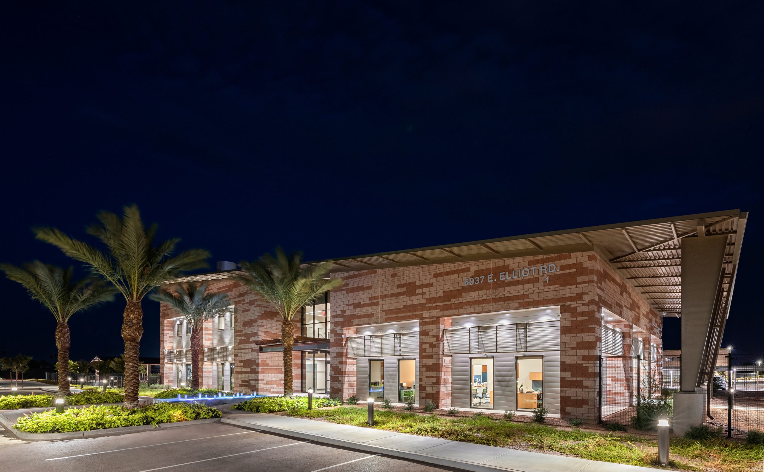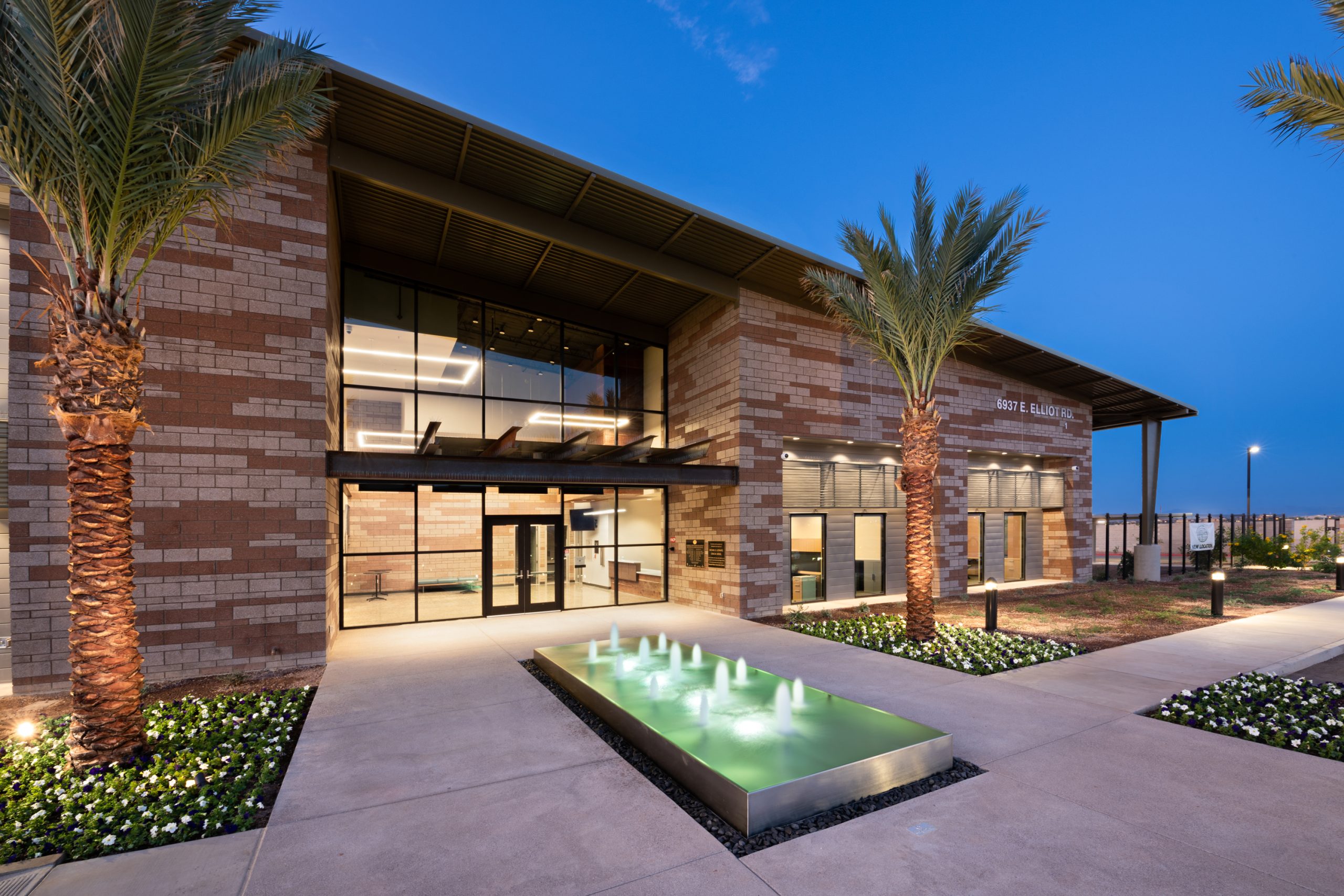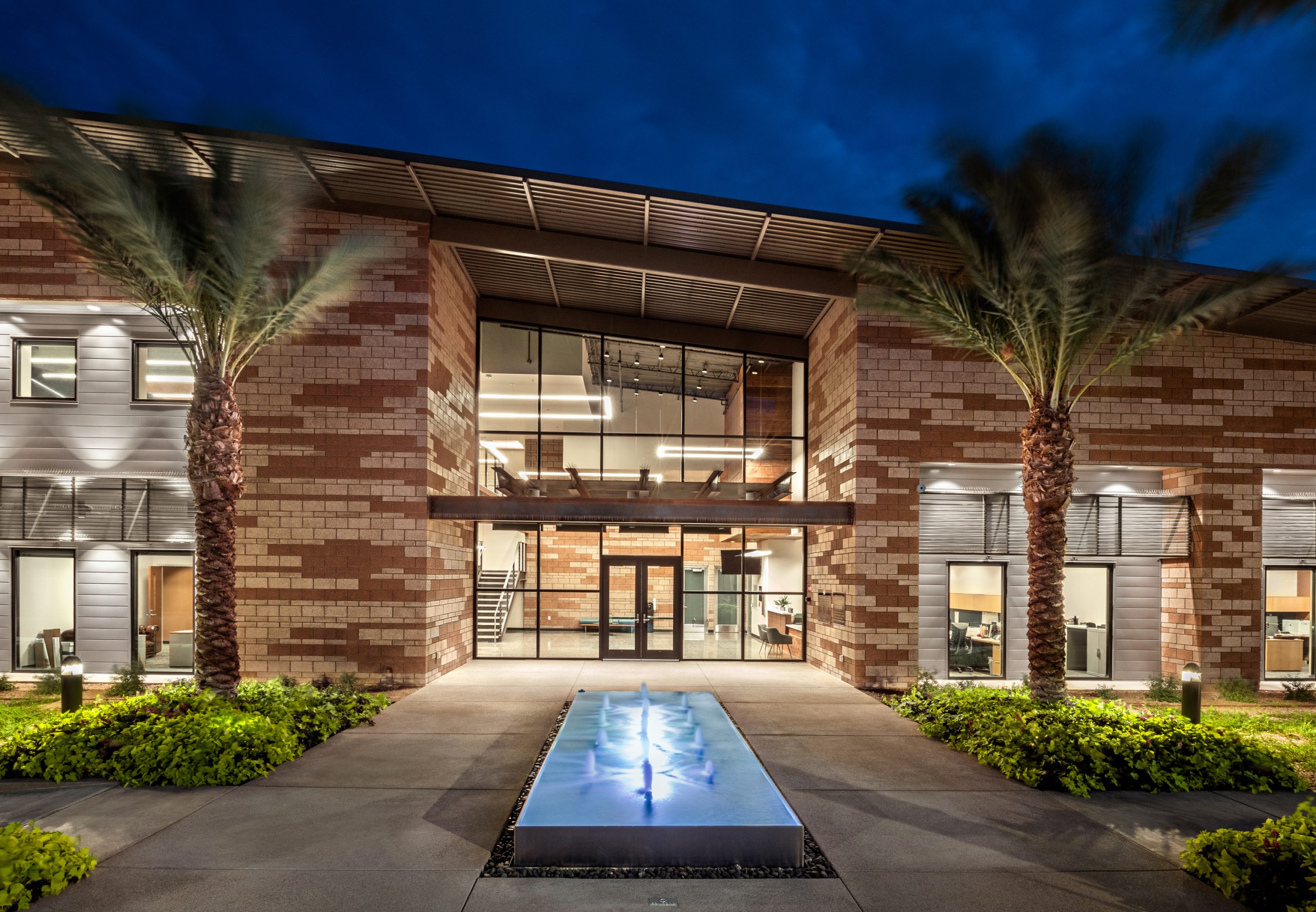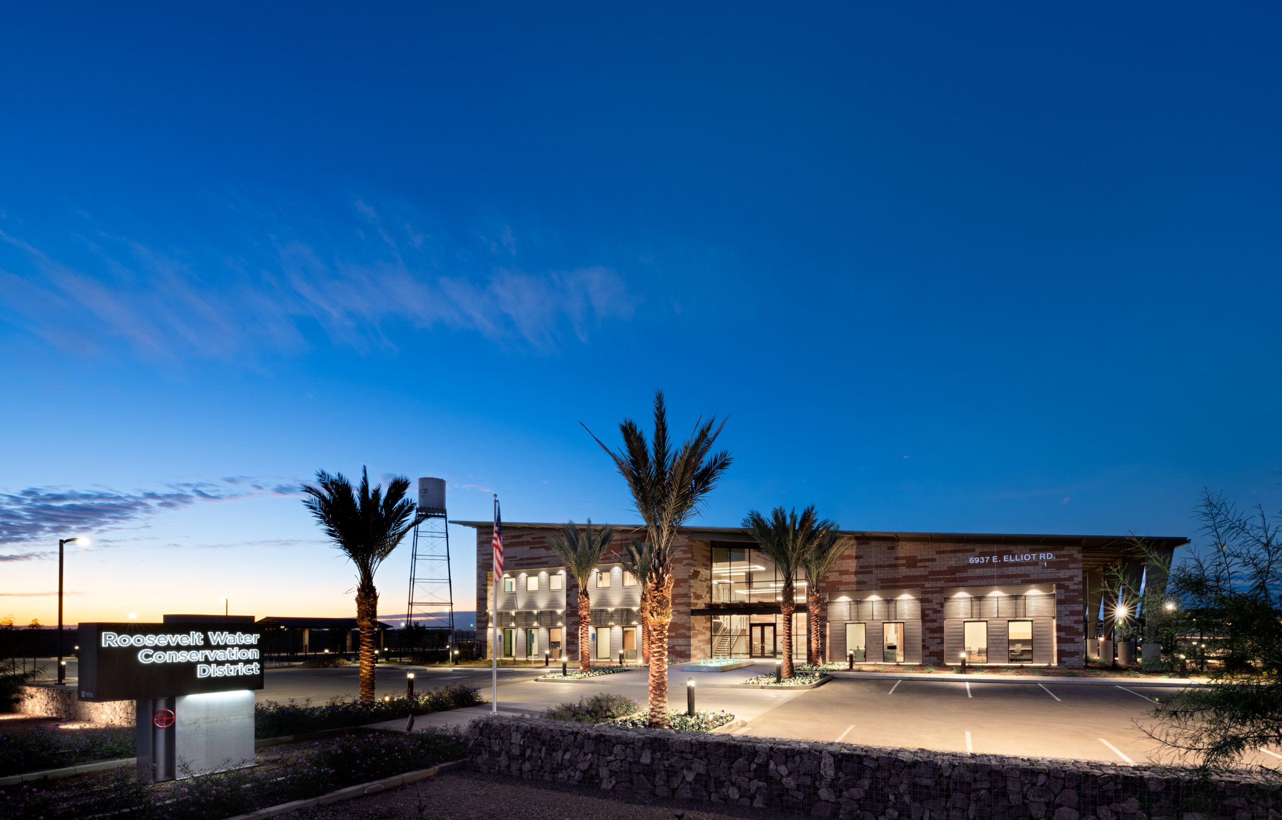 This new office building, the headquarters of Roosevelt Water Conservation District, includes a first and partial second floor with offices, lobby with reception area, meeting rooms and board room plus a basement for storage. A north facing entry offers a welcoming approach from the public parking in front, with staff and truck parking behind and to the sides of the building. Elevations feature windows to bring daylighting to the interior, recessed areas for shade and interest, and exterior block walls that are detailed in a variety of block sizes, colors and textures to add character. The building evokes a contemporary southwest flavor and utilizes a single-slope roof to bring elegance and simplicity to the massing, while directing rainfall to retention areas. Overall, the design concept of the facility is based on an agricultural vernacular that reflects Roosevelt Water Conservation District’s mission and program.