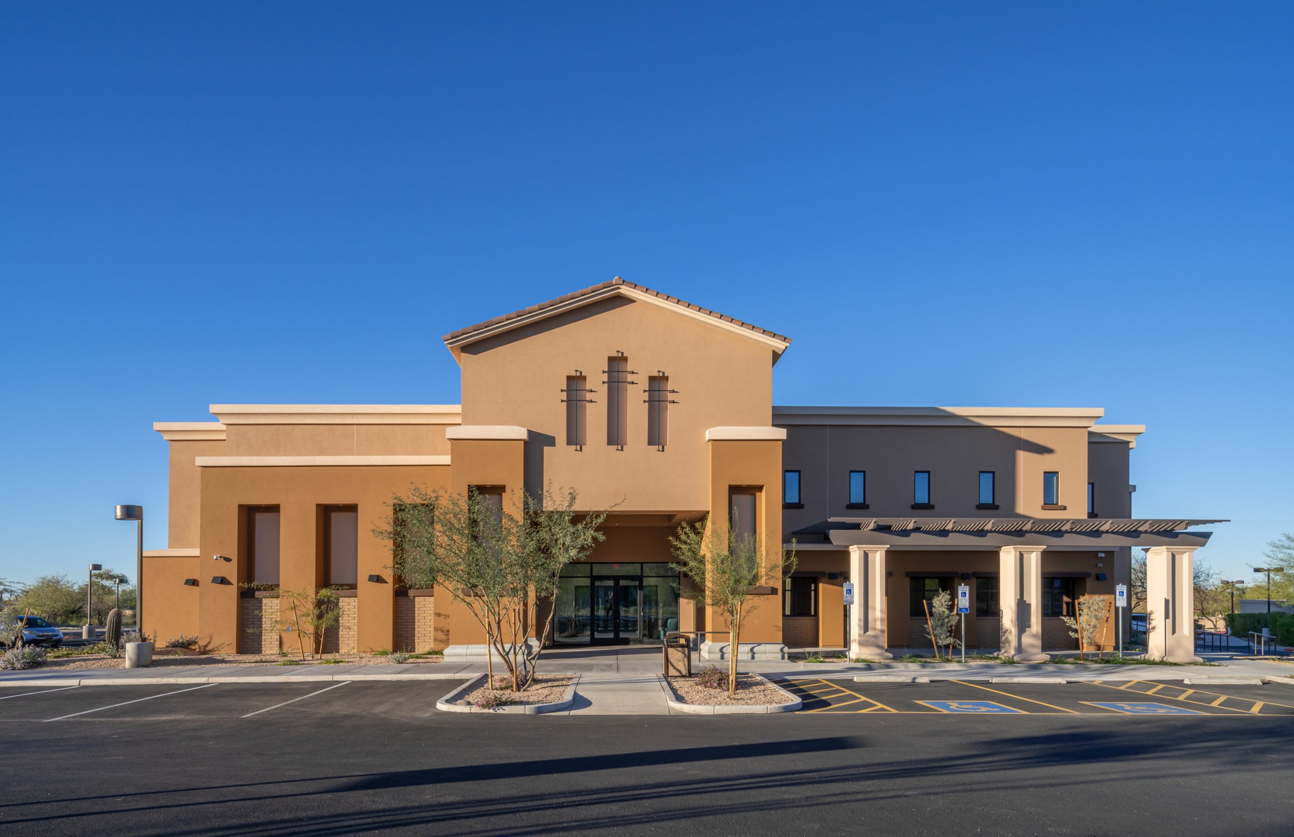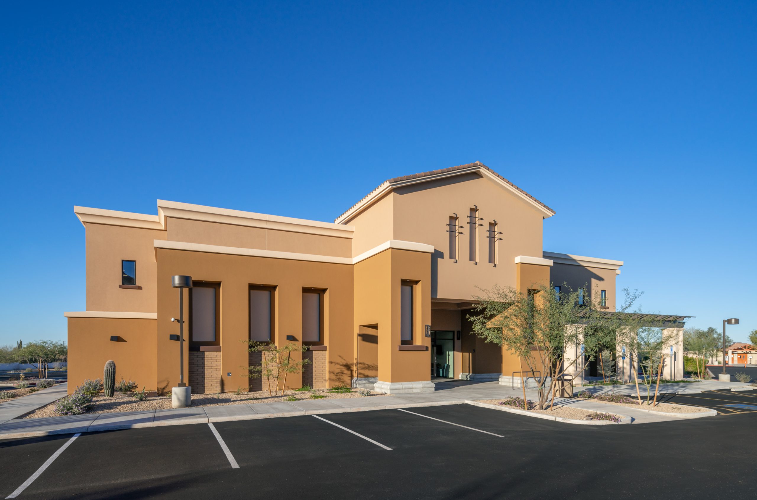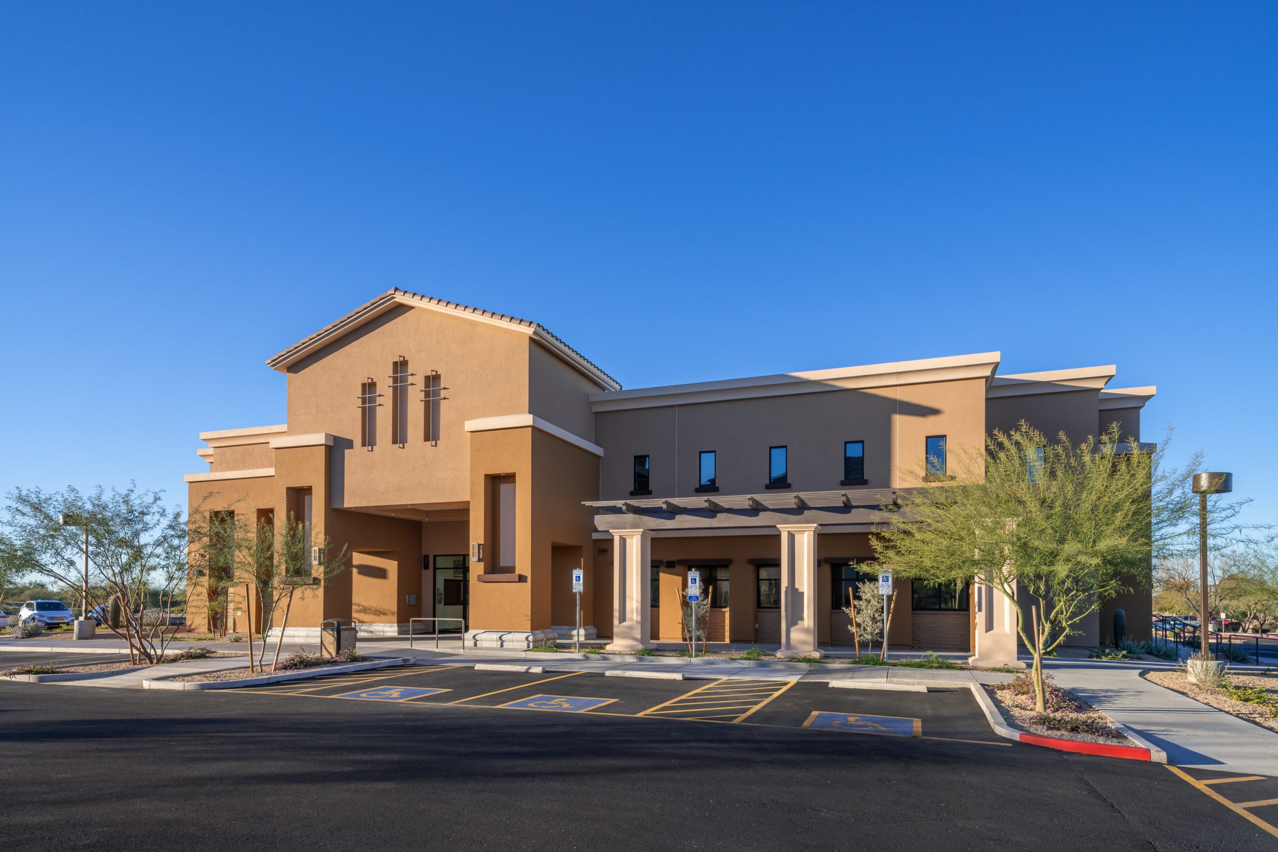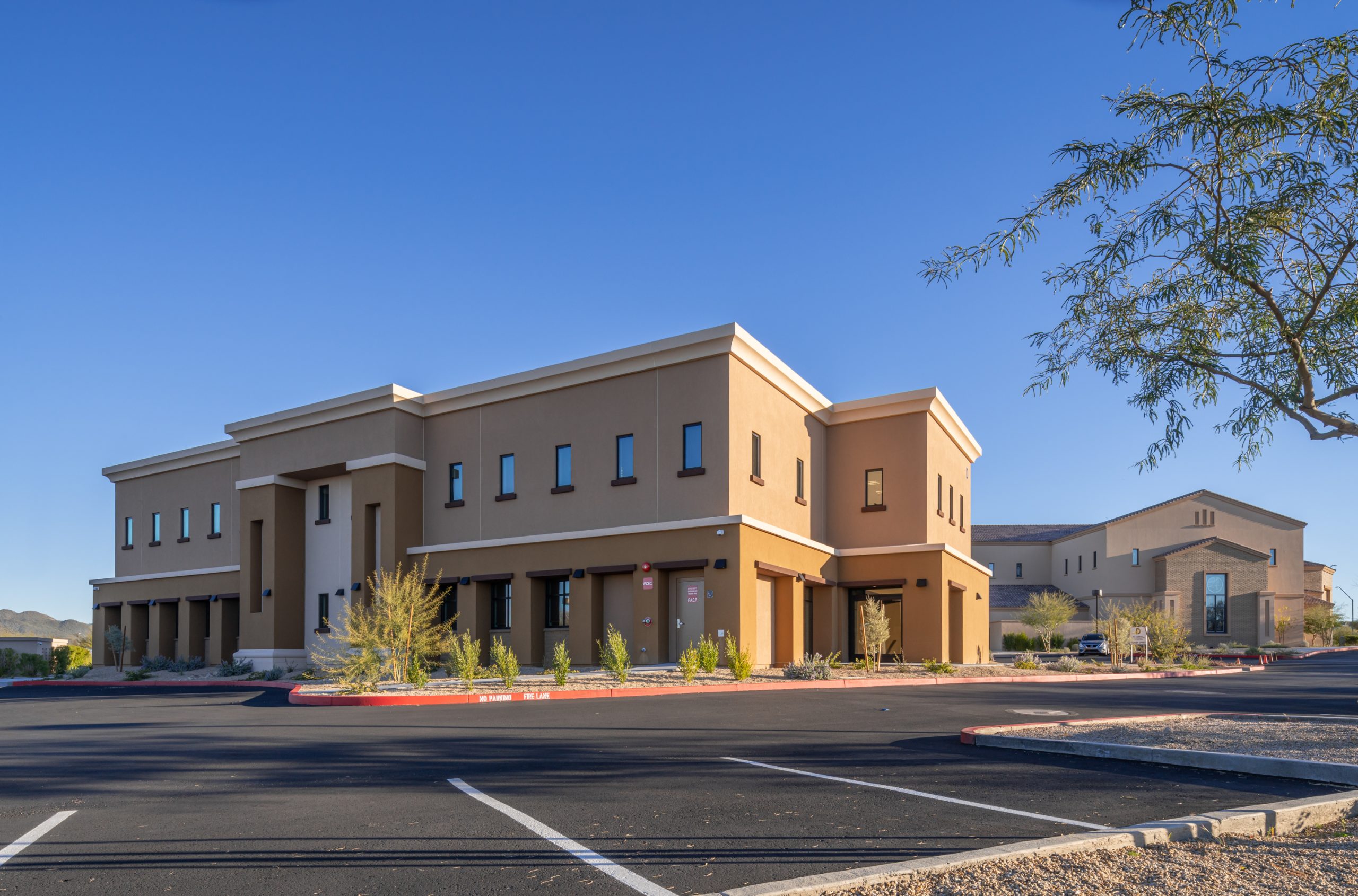 This new two-story building serves as the Administration and Faith Formation Center for the Parish committee members, replacing their previous one-story facility. The new structure primarily features private and open office spaces on the first floor, with adult religious education classrooms on the second floor. The development included minor site renovations around the building’s immediate surroundings, such as modifications to sidewalk and concrete areas and landscaping enhancements. Additional improvements include the introduction of new shrubs, low-scale plantings, decomposed granite, and trees native to the Arizona environment, all in accordance with the previously approved landscape plans for the master site development. Notably, there were no changes to parking or surrounding buildings.