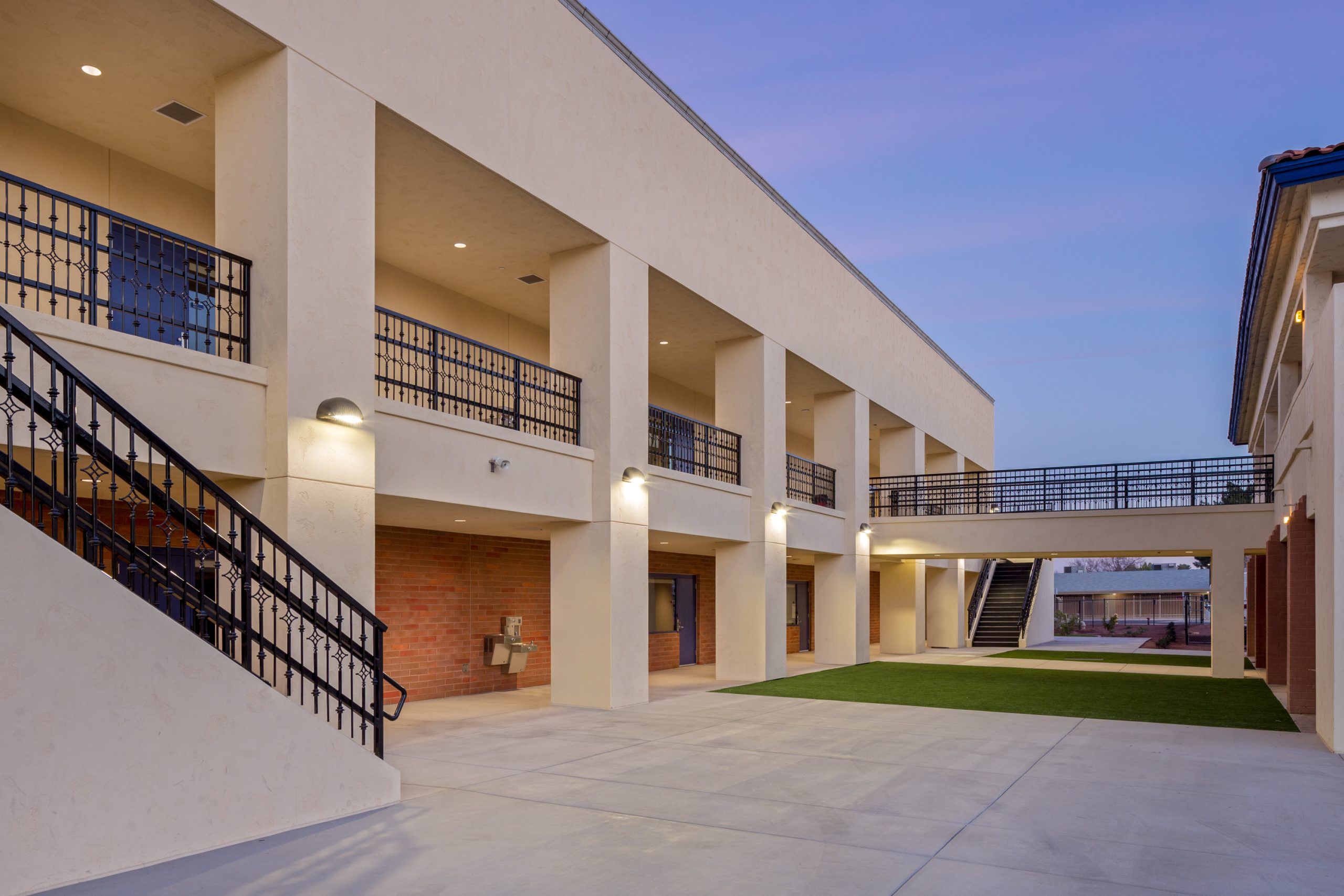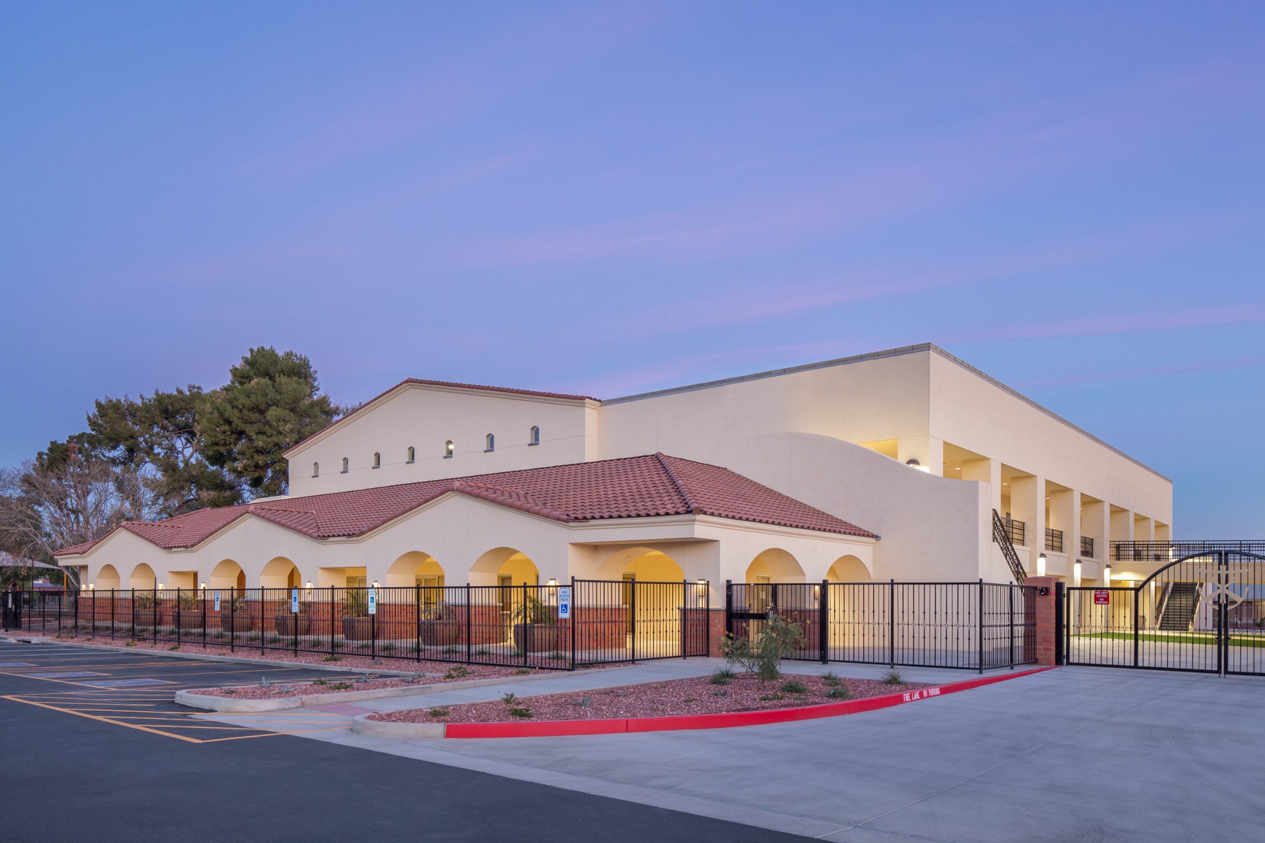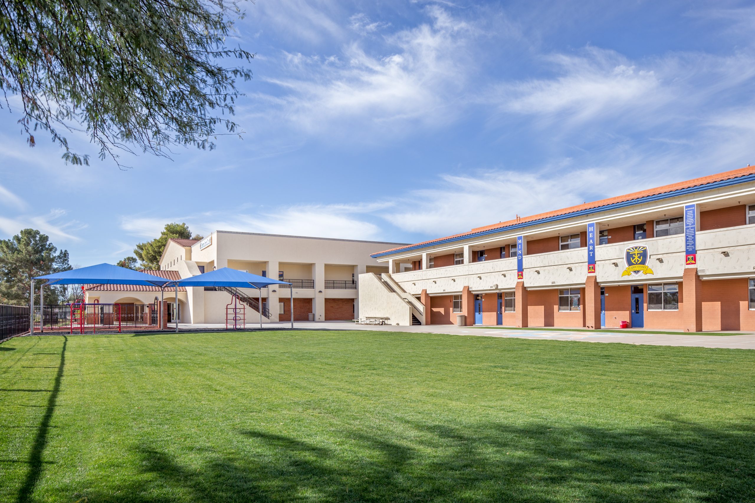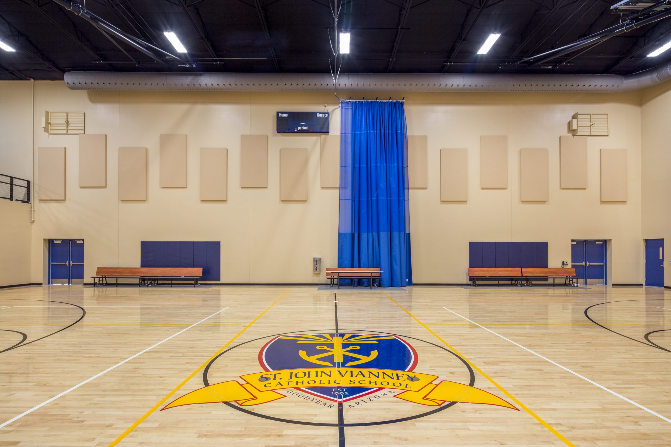 This new two-story multipurpose building adds needed program and expansion space to the existing St. John Vianney Catholic School campus in Goodyear, Arizona.  The building features a gymnasium, classrooms, kitchen and music areas, and has allowed the school to expand its curriculum, enhance student experience and provide a general overall improvement to the campus.