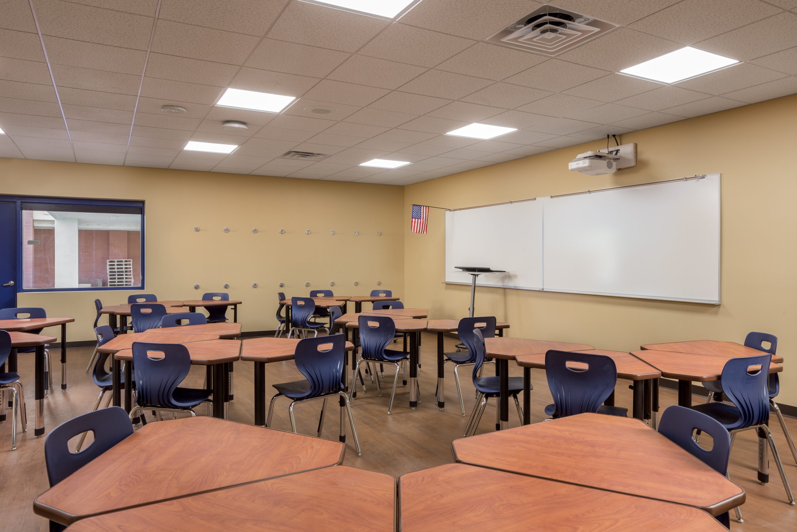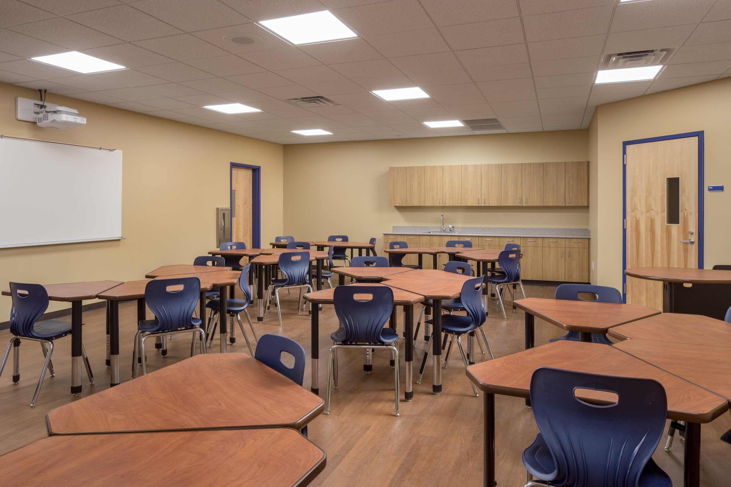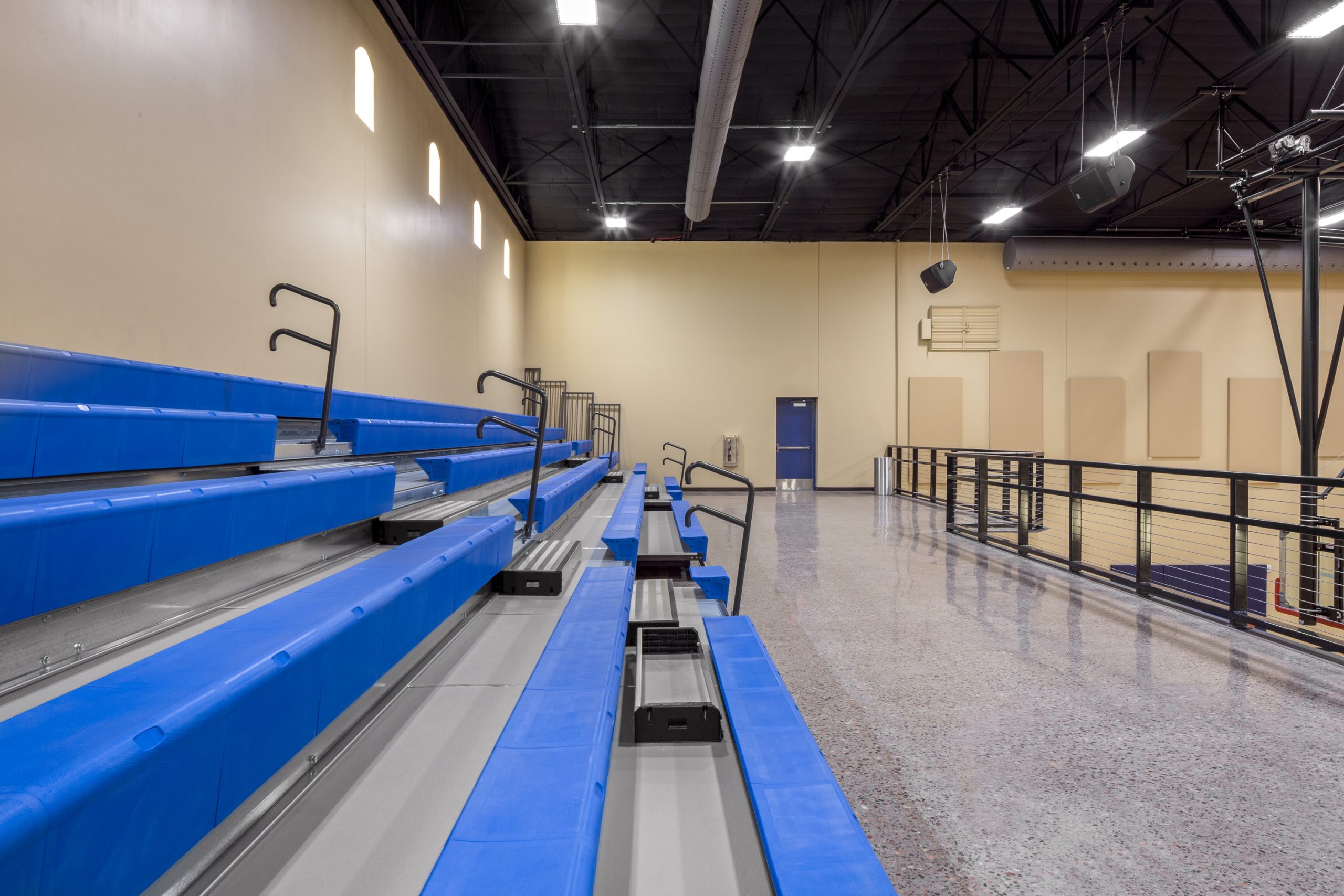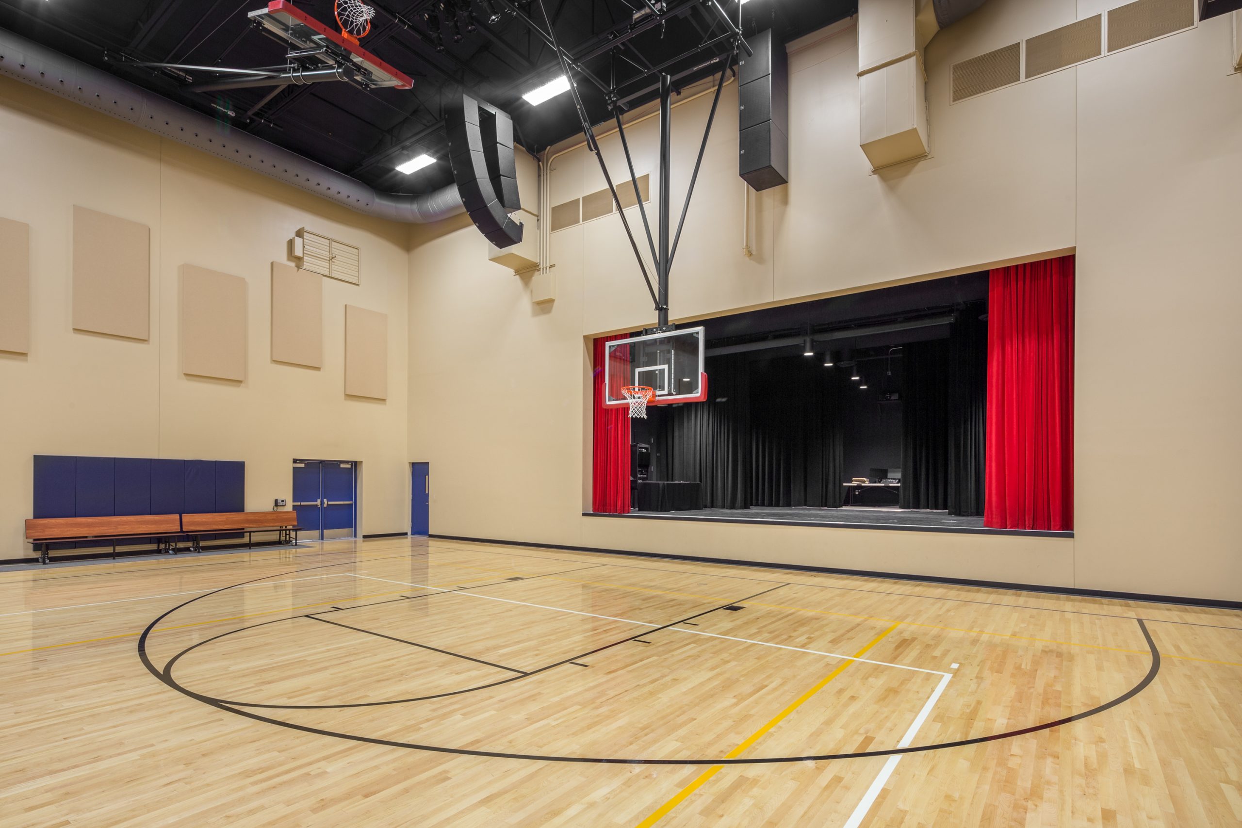 Inside, a spacious and daylight filled lobby is accessed via a storefront glass door system.  The lobby promotes student activities and provides access to a semi-open warming kitchen.  Beyond, the 7,525 SF gymnasium features a full basketball court with 6 hoops, bleacher seating and an open music platform flanked by storage areas at the far end of the space.  Ten new classrooms are located adjacent to the gymnasium, divided between the first and second floors.  Access to the classrooms is from the exterior, with exterior stairs providing access to the second floor.  At about 950 SF each, every two classrooms share a common study room.