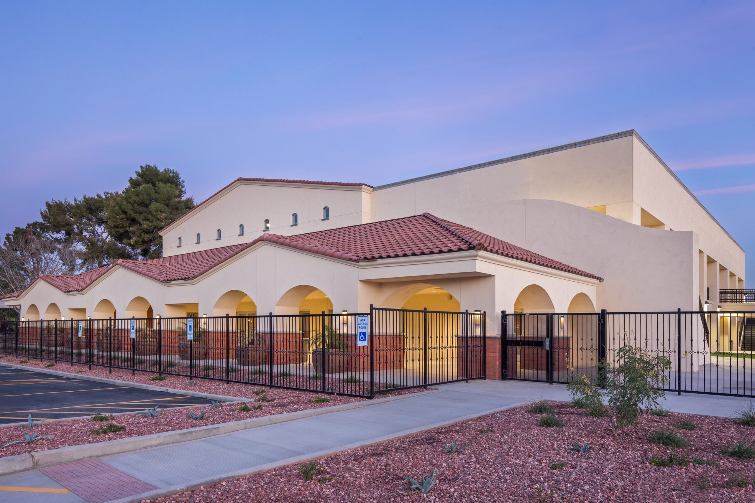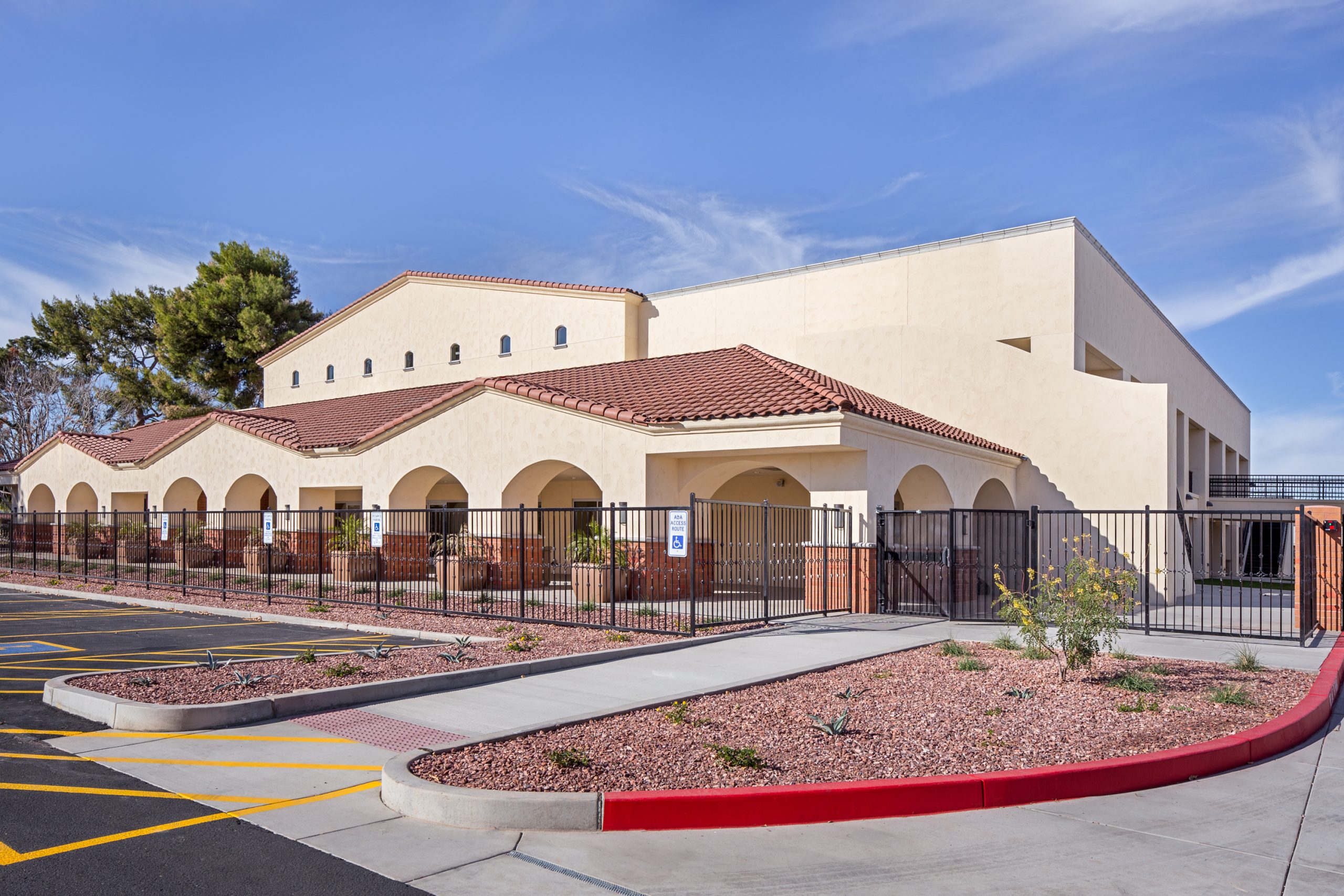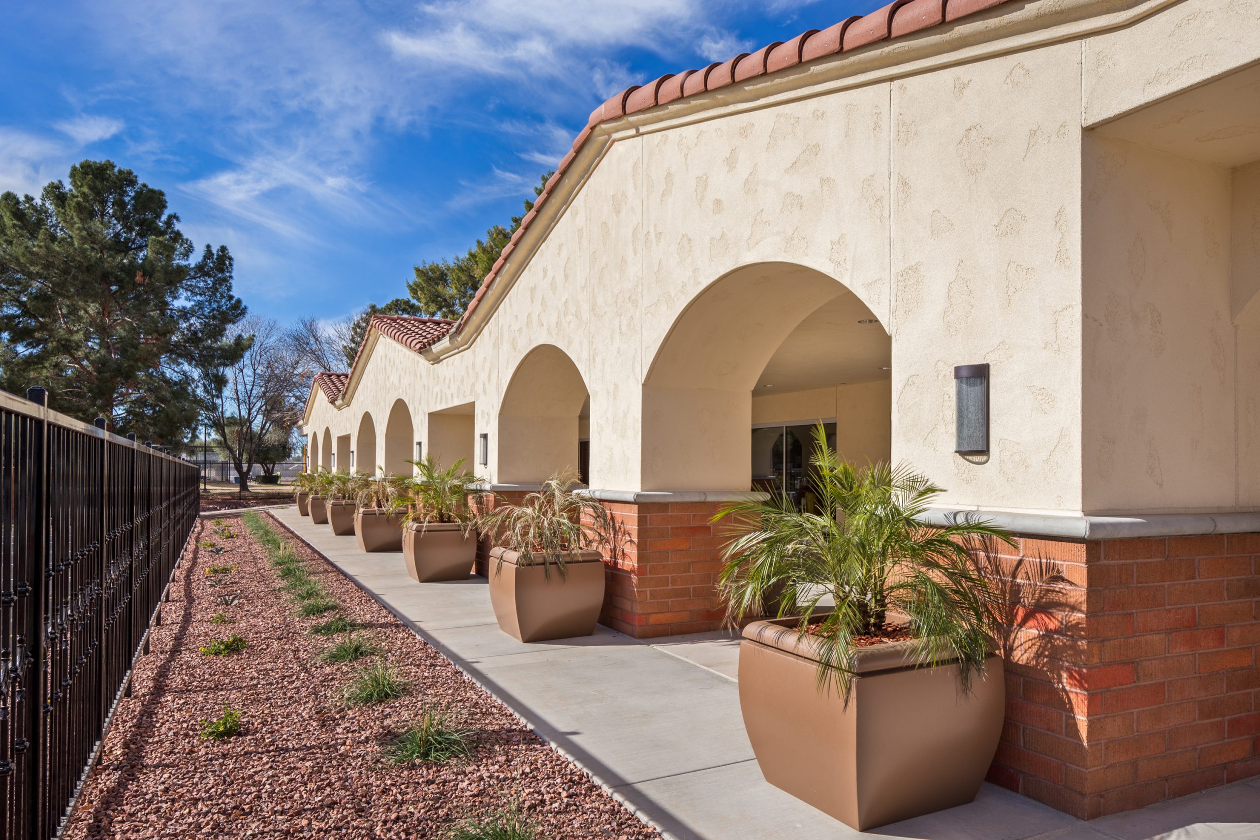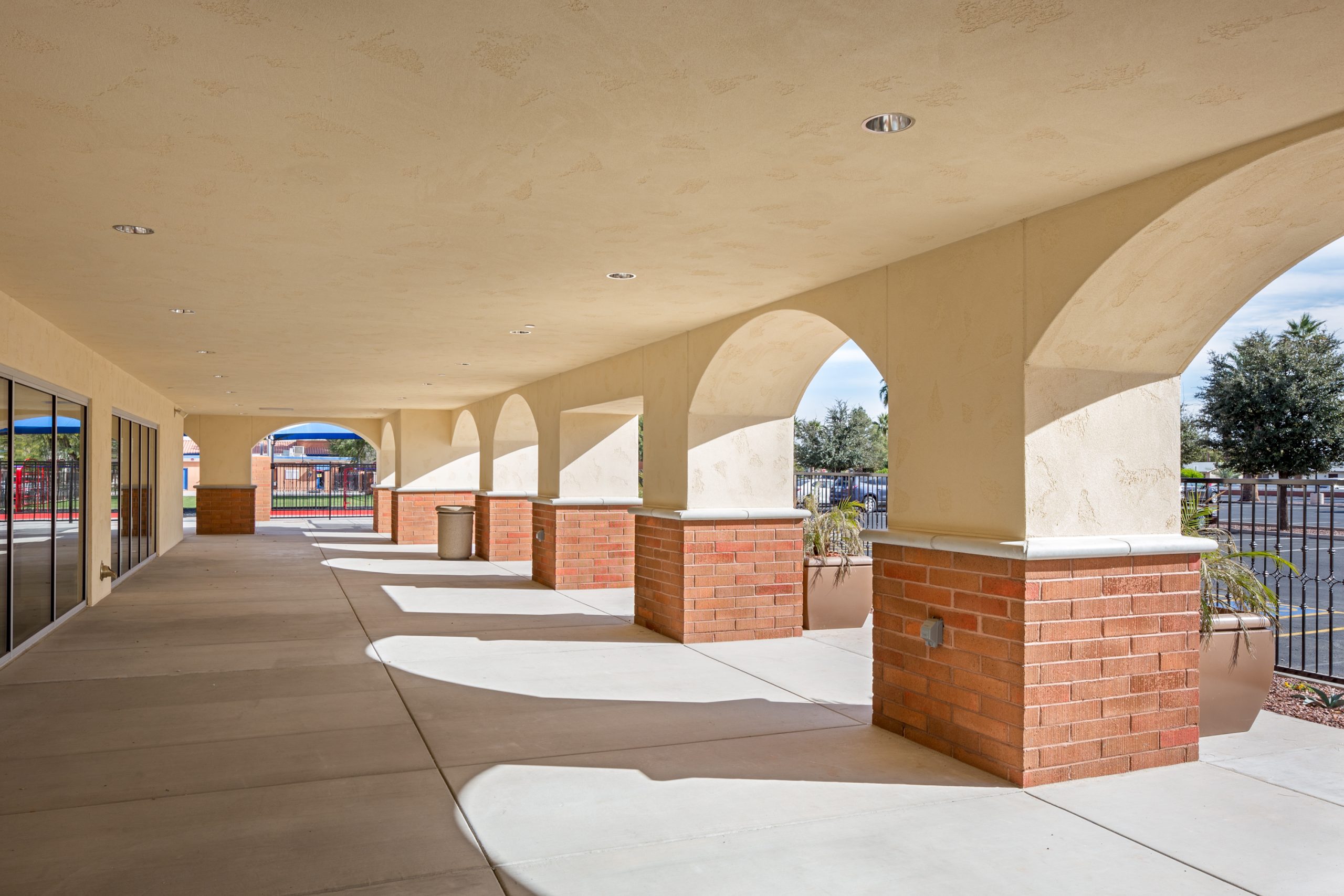 To provide a harmonious and compatible design, the architecture of the building reflects the existing campus, which mimics a Spanish colonial concept. A series of arches defines the main entrance of the building, and offers shade, comfort, and protection as well as an intriguing design that beckons to building users.  Gable roofs and hip roofs feature concrete roof tile to further reflect a Spanish colonial design, while a synthetic finish system is used at most of the exterior walls with a Spanish lace texture and light cream color appearance to maintain coherency with the existing campus.  Exposed masonry is used as a wainscot accent at the columns and along several exterior walls.  Decorative elements such as column moldings, sills, and parapet caps add variety and interest to the overall architecture.