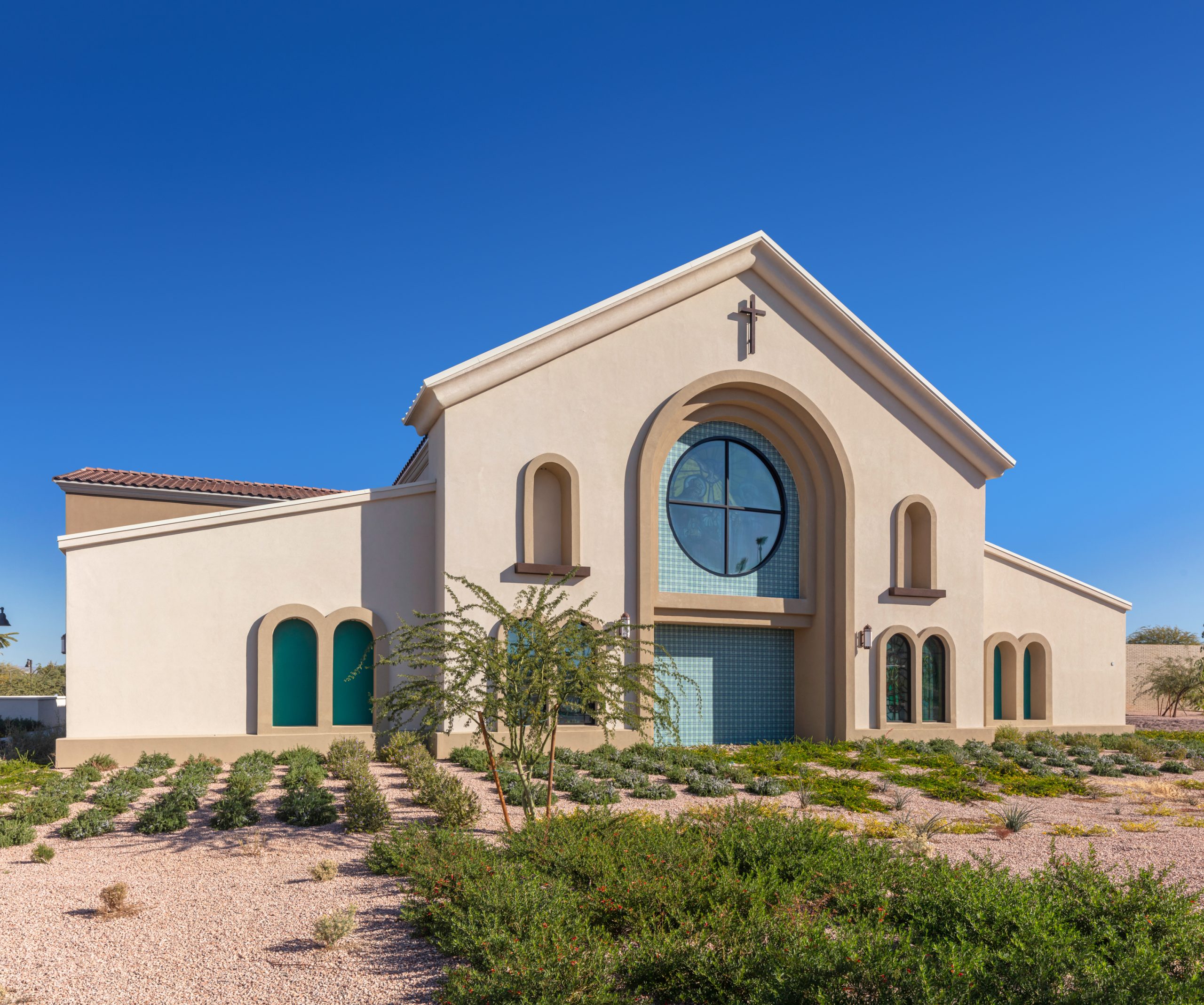 The main exterior finishes include EIFS (exterior insulating finishing system) and stone veneer applications. The color and materials palette that combines stone materials with a white base color and turquoise accent colors presents a Spanish Southwestern architecture that acknowledges both Catholic Diocese needs as well as our native Arizona environment.
