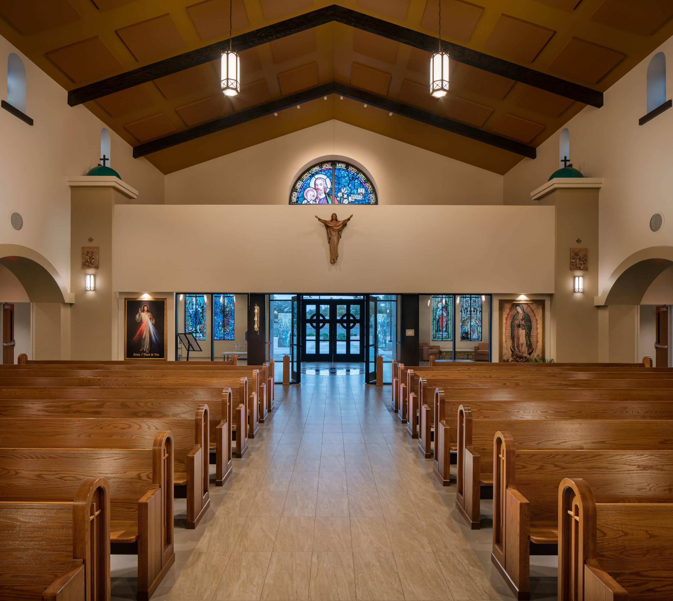 The exterior design of the church is rendered in a traditional Spanish style that reflects Southwestern influences. Specific design elements include stained glass rose windows with archway pop-out details highlighting the architecture and bell towers that flank each side of the narthex entry.