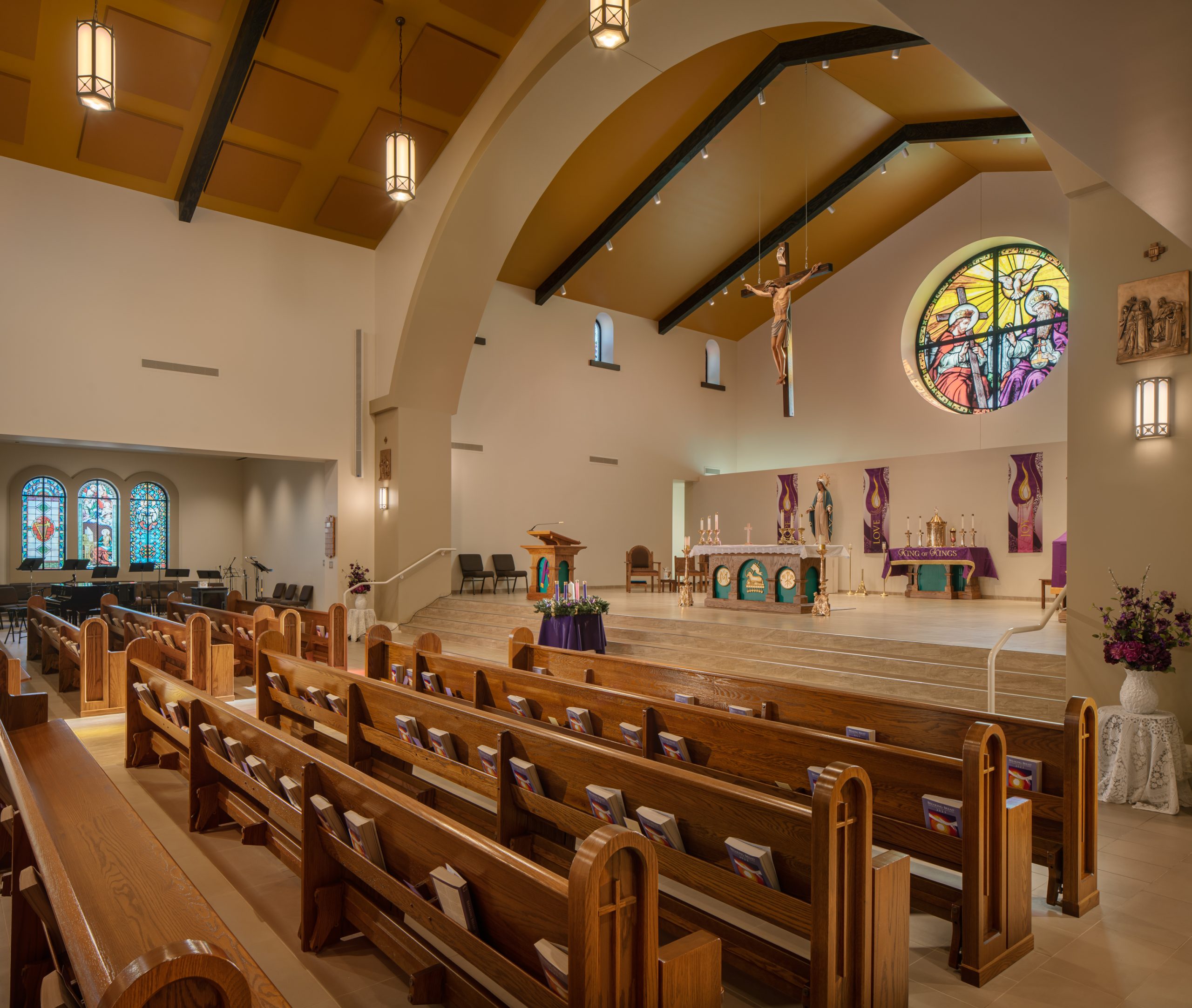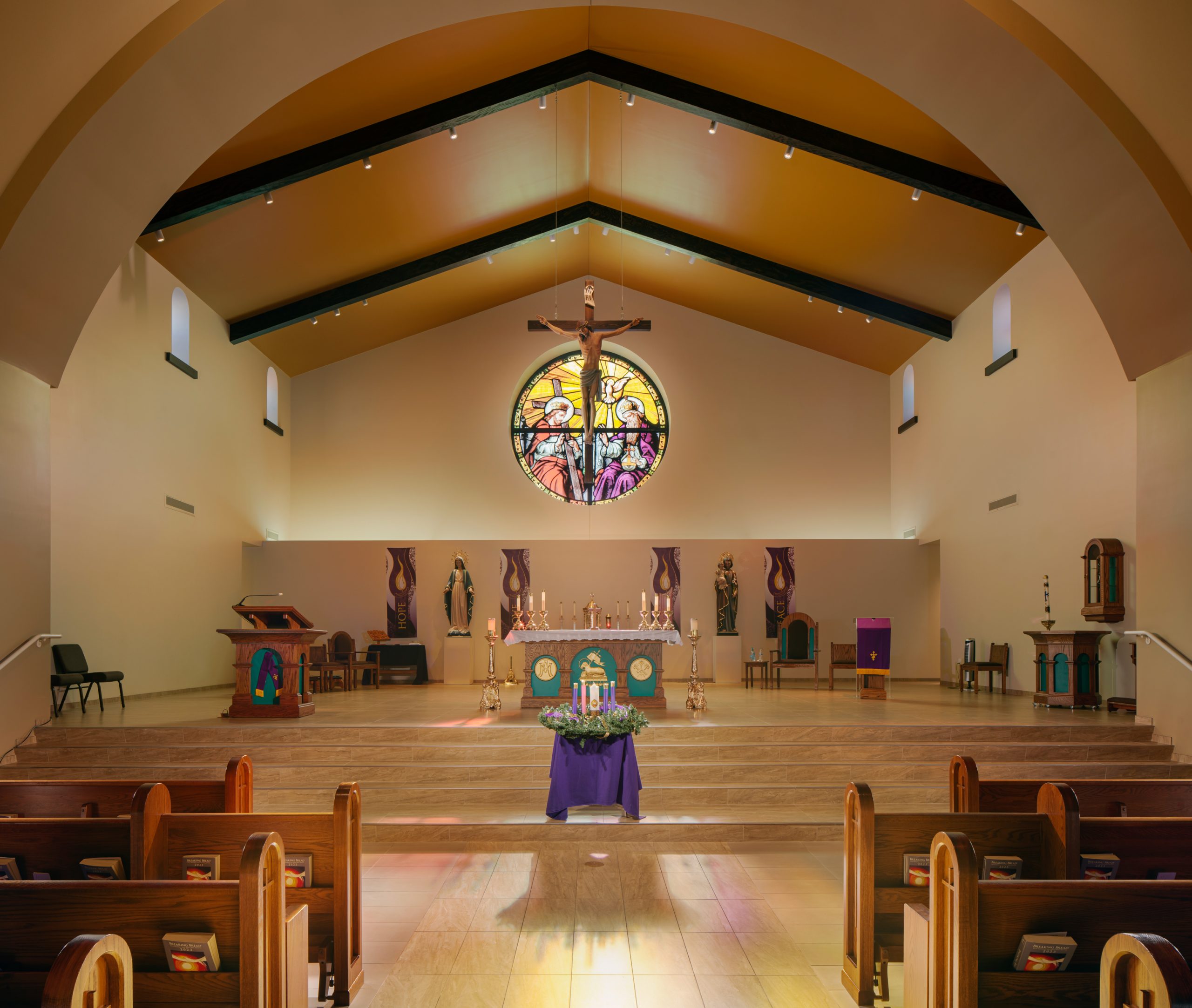 The St Joseph Catholic Church was created to replace a church that had been destroyed by a tragic fire. Parish members desired a facility with a different approach than the original, and so the new design was based on a “basilica” style that represents traditional form, space and order rooted in Catholicism.