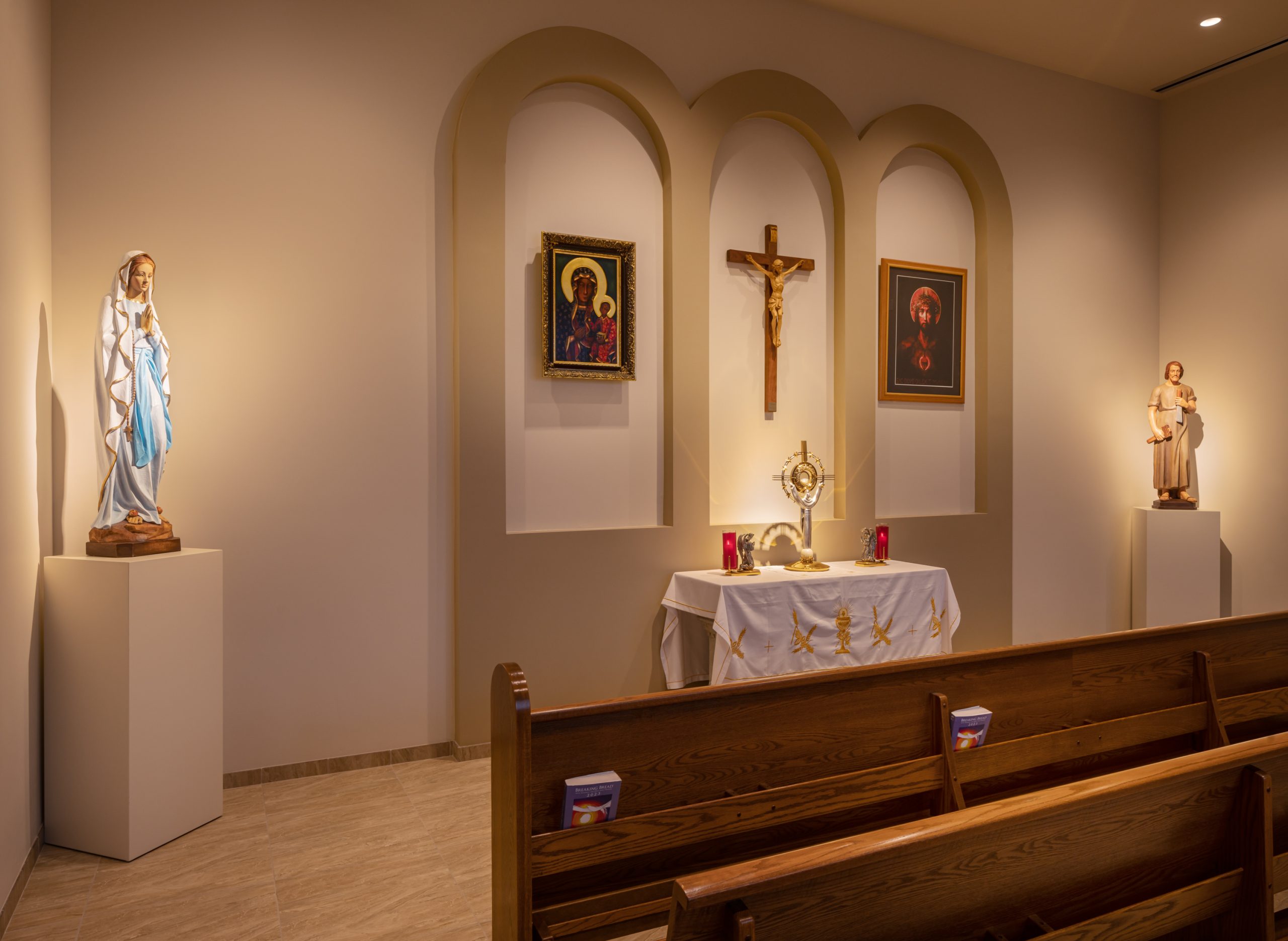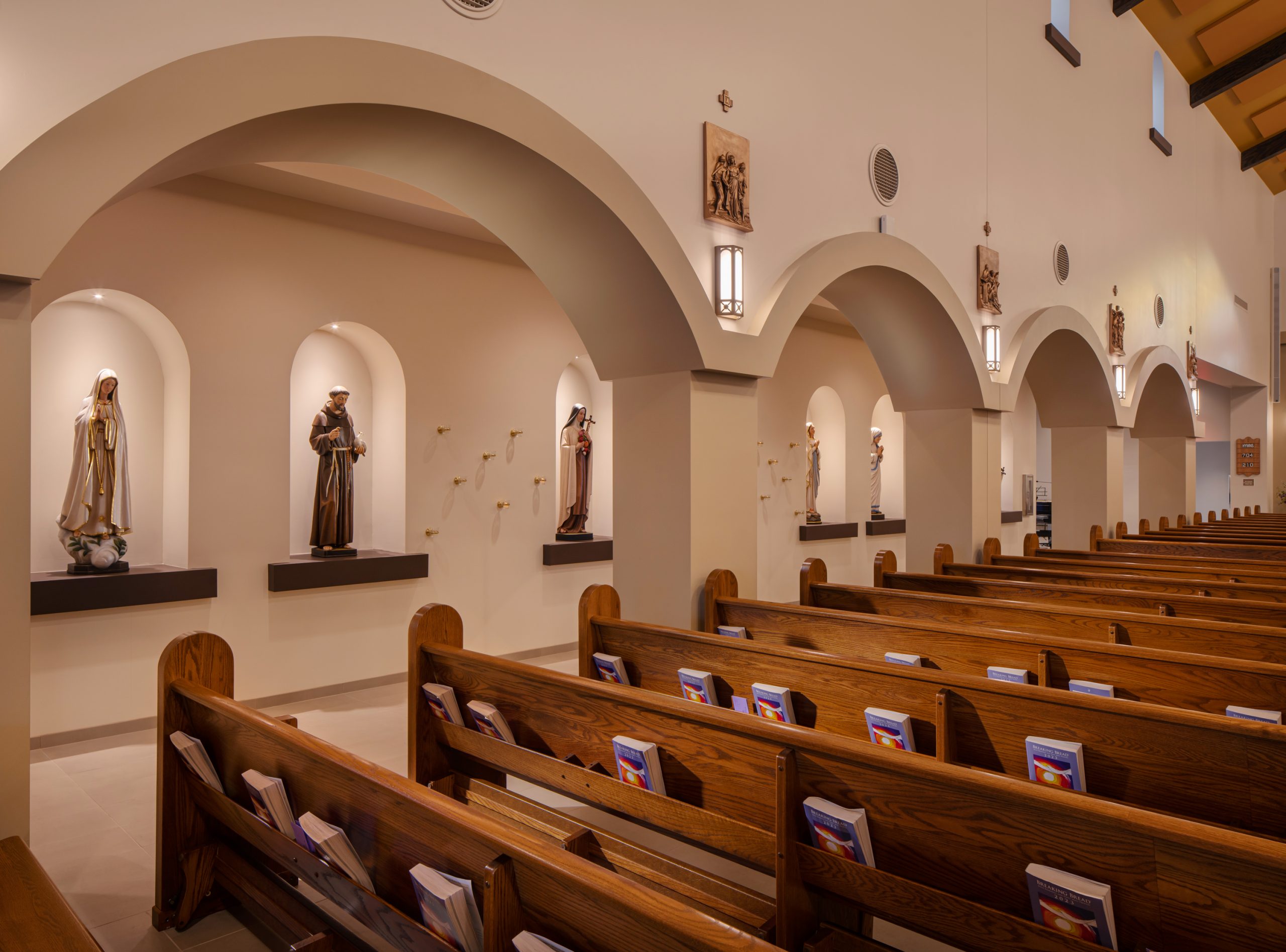Key programmatical spaces include the ‘narthex’ or entry area, the ‘nave’ which is the main pew seating area for parishioners, two transepts (one on each side of church) that consist of an adoration chapel and choir room, and finally the sanctuary space at the end with related sacristy spaces.